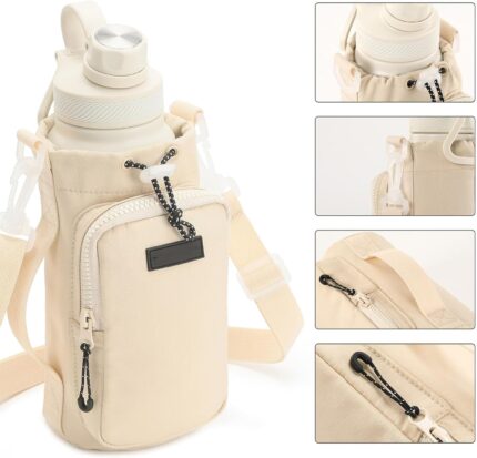 Nylon Sports Water Bottle Holder with Shoulder Strap – Durable Insulated Bottle Carrier for 32oz Bottles – Ideal for Hiking and Sports with Multifunctional Front Pocket (Baige)
