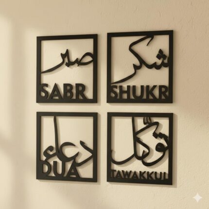 Islamic 3D Wall Hanging Wooden Home Decor, Arabic Calligraphy Wall Art Set, Sabr Shukr Dua Tawakkul, Black Frame, 4 Piece Set for Living Room Office Balcony