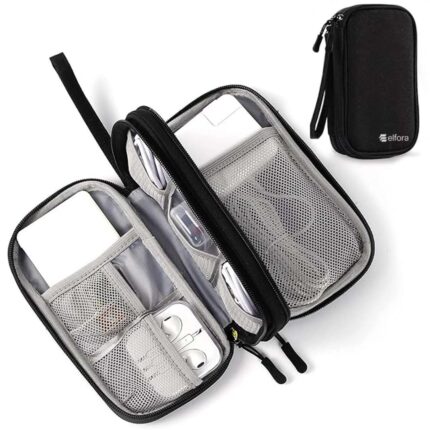 Elfora Cable Organizer Pouch | Travel Organiser Bag | Double Layer Storage for USB Cables, Chargers, Earphone, Power Bank, Hard disc & Other Accessories | Durable Nylon Case with Mesh Pockets (Black)