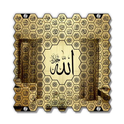 Luxury 99 Names of Allah Islamic Acrylic Wall Art | Golden Honeycomb Calligraphy with Glass Finishing Decor | Allah Name for Home, Mosque, Office | Muslim Gift | Islamic Wall Hanging | 24×24 Inch (Golden & Black)