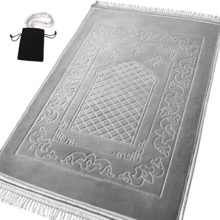Islamika Prayer Mat Thick Islamic Muslim Rug – Padded mat Sajadah Men Women with Islam Prayer Beads for Eid Travel Ramadan, Soft and Padded (Gray)