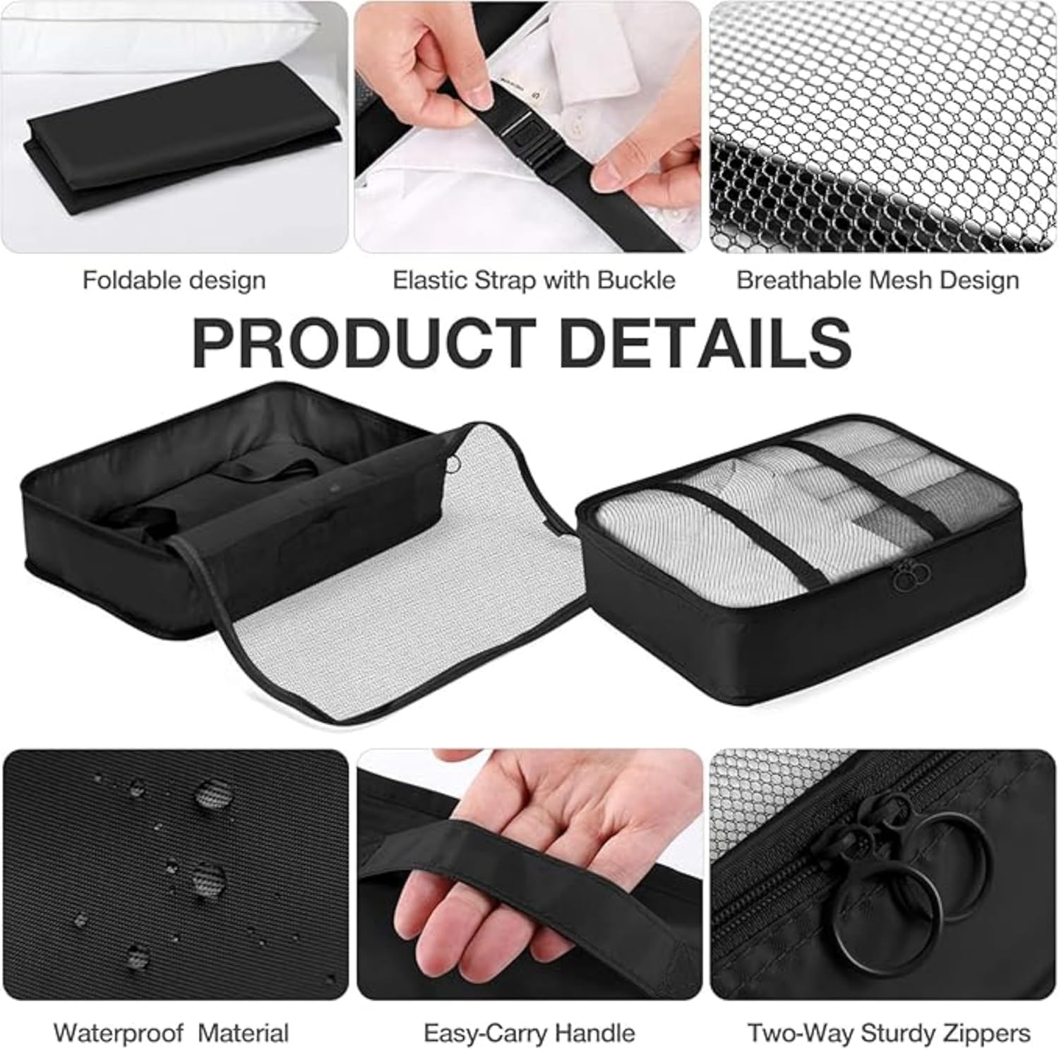 1 × Large Packing Cube – Ideal for shirts, trousers, or jackets 1 × Medium Packing Cube – Perfect for t-shirts, tops, or light wear 1 × Small Packing Cube – Great for undergarments or small clothing items 1 × Shoe Bag – Keeps footwear separate and clean 1 × Underwear Organizer – For bras, panties, or intimate wear 1 × Sock Pouch – Keeps socks and ties in place 1 × Toiletry Bag – For shampoos, creams, toothbrushes, etc. 1 × Cosmetic Bag – Ideal for makeup and skincare items 1 × Flat Zipper Pouch – For documents, accessories, or electronics 1 × Laundry Bag – For separating used clothes during travel Stay organized and travel smart with this all-in-one 10-in-1 Travel Organizer Set! Designed for frequent flyers and casual travelers alike, this versatile set includes everything you need to keep your luggage neat and your essentials easily accessible. Made from durable, water-resistant nylon, each piece is lightweight yet strong enough to withstand the rigors of travel. Each packing cube is designed to maximize space, reduce clutter, and protect your belongings. The breathable mesh tops allow for visibility and ventilation, while the strong zippers ensure smooth and secure closure. Whether you’re going on a short trip or a long vacation, this lightweight set will keep your luggage tidy and stress-free.