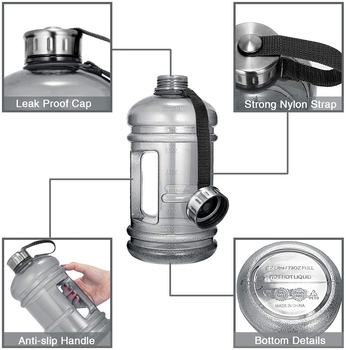 - Product Dimensions (L x B x H): 27 cm x 13.5 cm x 13.5 cm Huge capacity of 2.2 litres, Perfect for water, sports drinks, amines and other cool drinks that keep you hydrated Handle is built into the design and the large neck strap makes it easy to carry Made of quality material and comes with the latest design pop cap to make drinking from the gallon easier