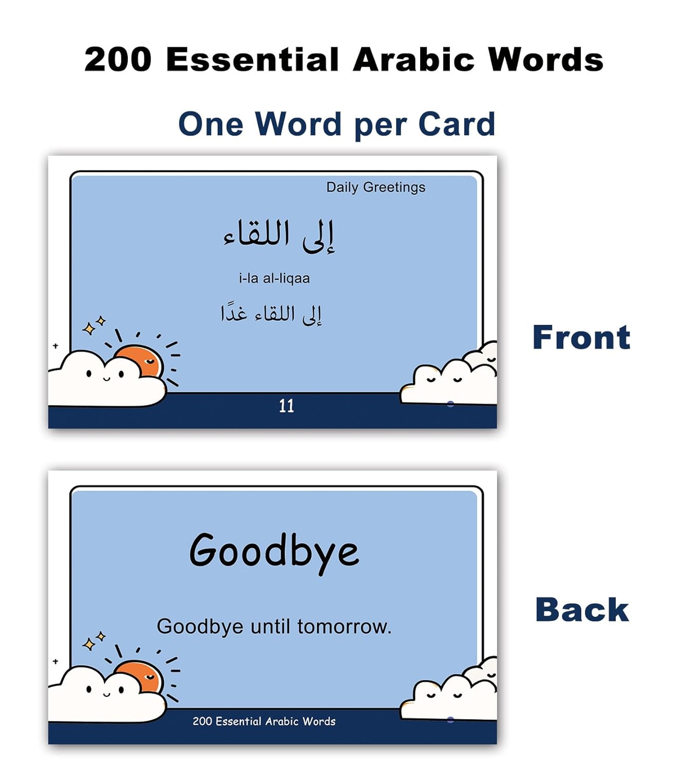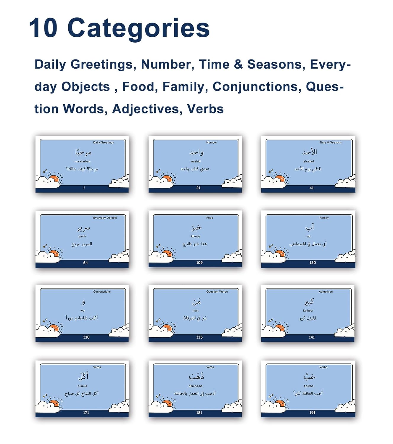 Arabic Conversational Phrase Flash Cards – These Arabic vocabulary for English speakers are perfect for anyone who wants to master basic vocabulary and conversation skills, enabling both kids and adults to learn essential Arabic words in a fun and effective way.