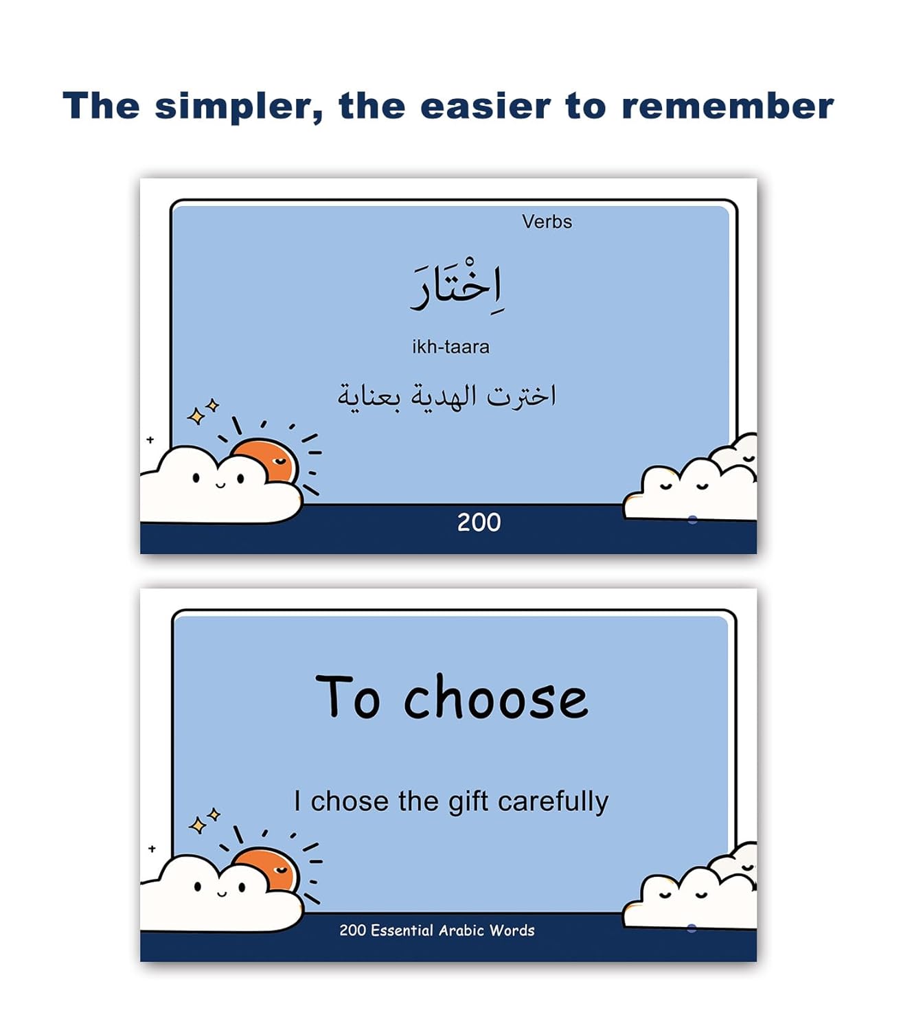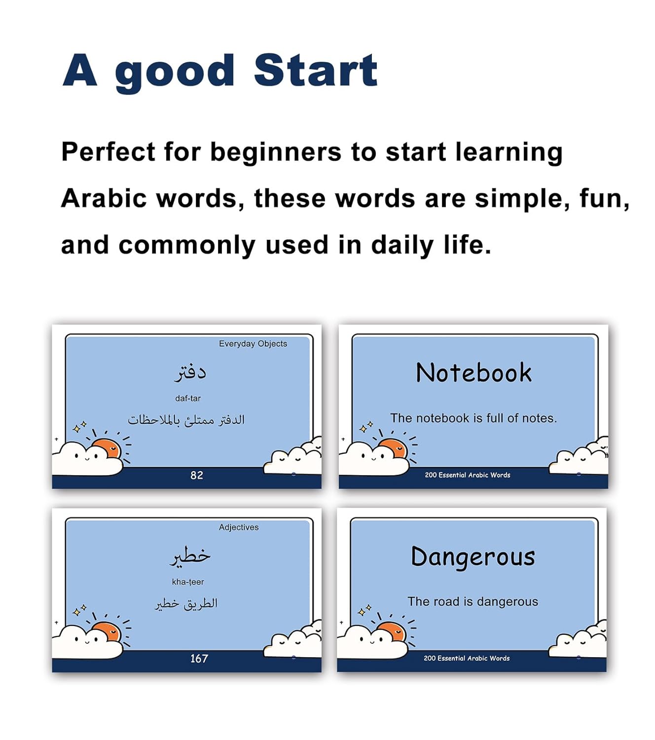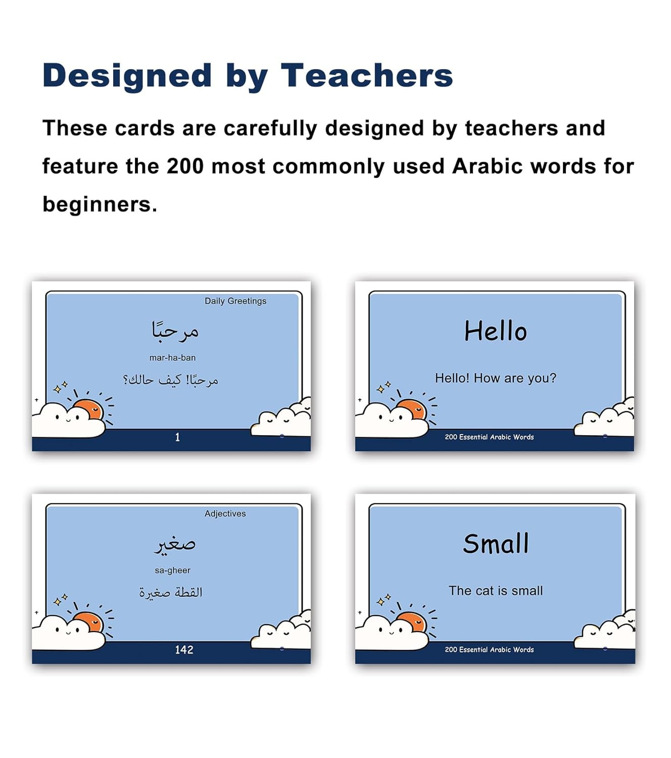 Designed by Arabic Teachers – Using their years of teaching experience, these Arabic vocabulary Flash Cards contain 200 Basic Arabic words for beginners that are carefully selected to make learning fun and easy.