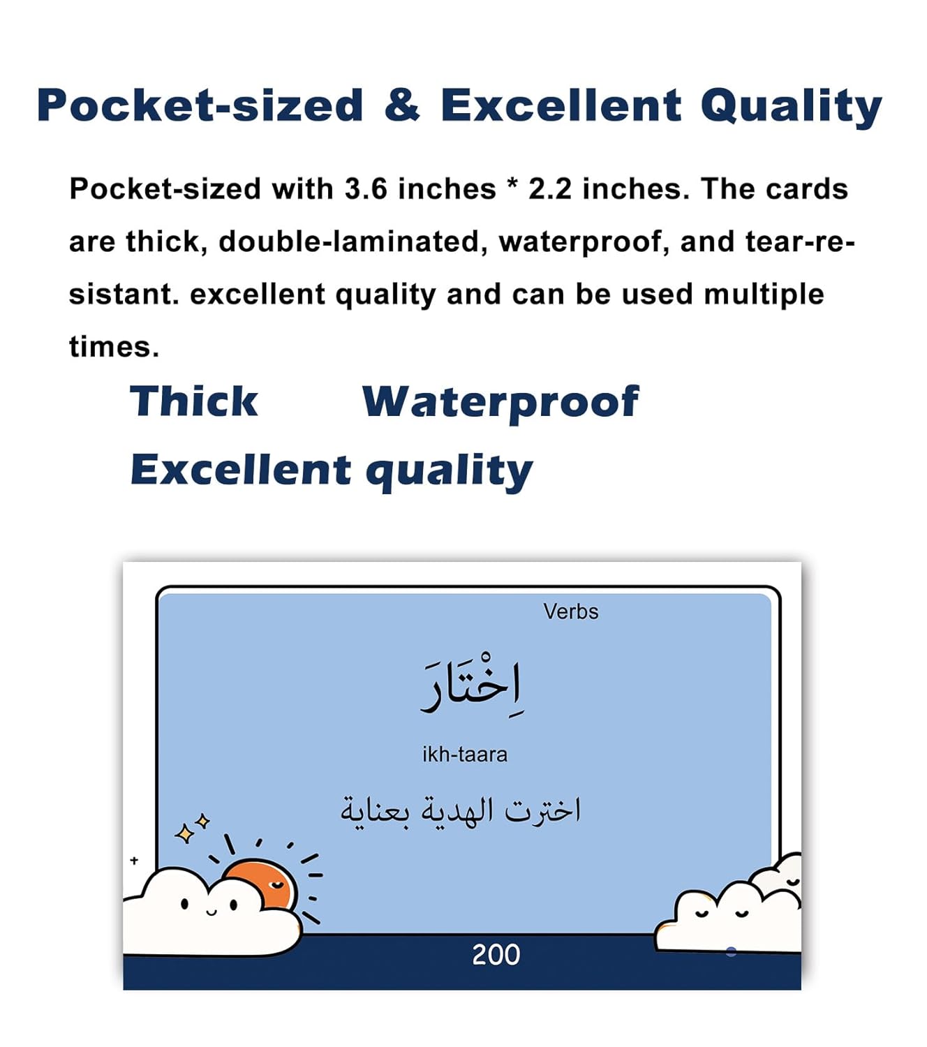 High-quality & Pocket-sized – These Arabic words flashcards are ideal for on-the-go language practice, being portable, durable, and water-resistant. They are also perfect for frequent use and suitable for both classroom and individual use.
