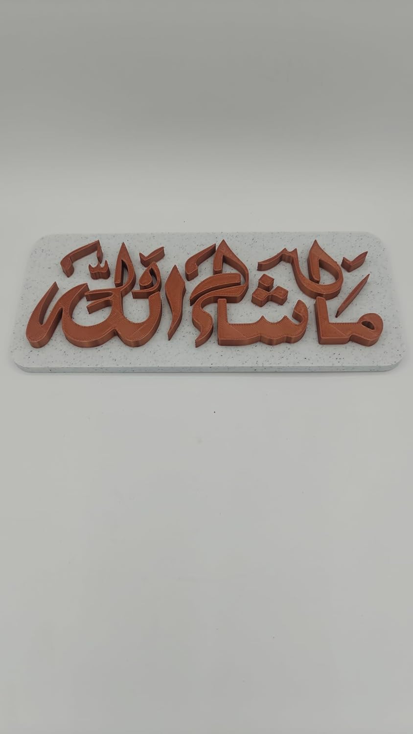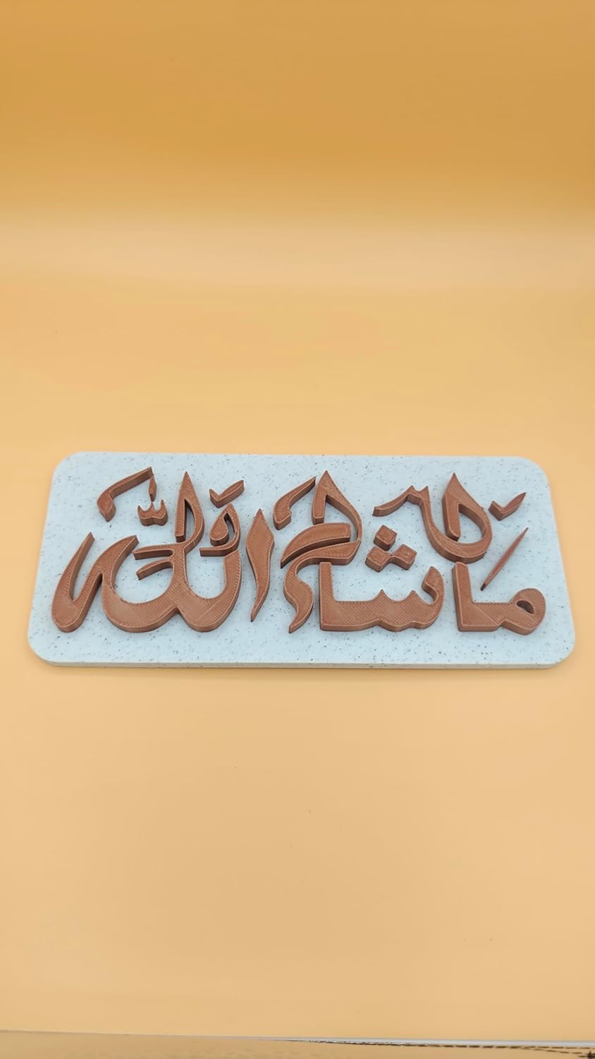 3D Hive Add a touch of spiritual elegance to your home with this beautifully designed Mashallah Islamic Wall Frame. Featuring stunning Arabic calligraphy, this decorative plaque symbolizes blessings, protection, and gratitude. The elegant design makes it a perfect addition to your living room, bedroom, entrance, office, or prayer space. Crafted with attention to detail, the raised lettering gives the frame a modern and artistic look that enhances any wall décor. This Islamic wall décor piece is lightweight, durable, and easy to place on walls, shelves, or tables. Its minimal yet meaningful design blends perfectly with modern and traditional interiors. The Mashallah calligraphy represents appreciation and protection from negativity, making it a thoughtful decorative item for your home. It is also an excellent gift choice for housewarming, Eid, Ramadan, weddings, and special occasions, bringing blessings and beauty to any space. The stylish combination of colors and clean finishing makes this wall frame a unique spiritual décor piece that enhances the atmosphere of your home.