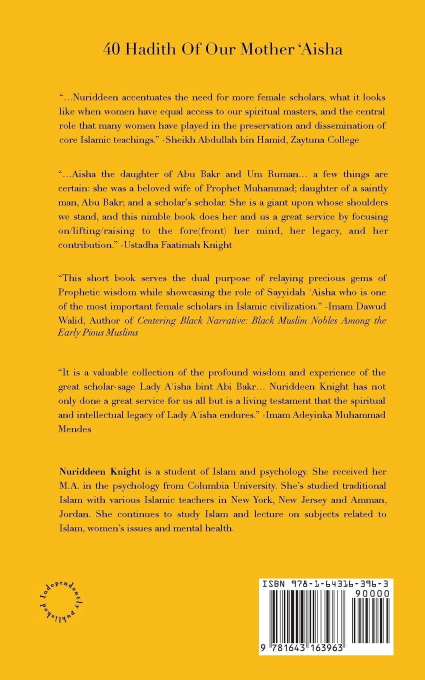 This book is an English compilation of 40 sayings (hadith) from the Prophet Muhammad, peace to him narrated by ‘Aisha, may God be pleased with her. The narration of prophetic speech is among one of the most important tasks in Islam. Without the preservation of prophetic speech, each generation would be more and more confused as to what it means to live an ethical and moral life in accordance with the pleasure of God. ‘Aisha is one of the great hadith narrators who kept the speech of the prophet, peace to him, alive by memorizing his words during his lifetime and teaching them to others after his death. This work is an extension of ‘Aisha’s legacy.