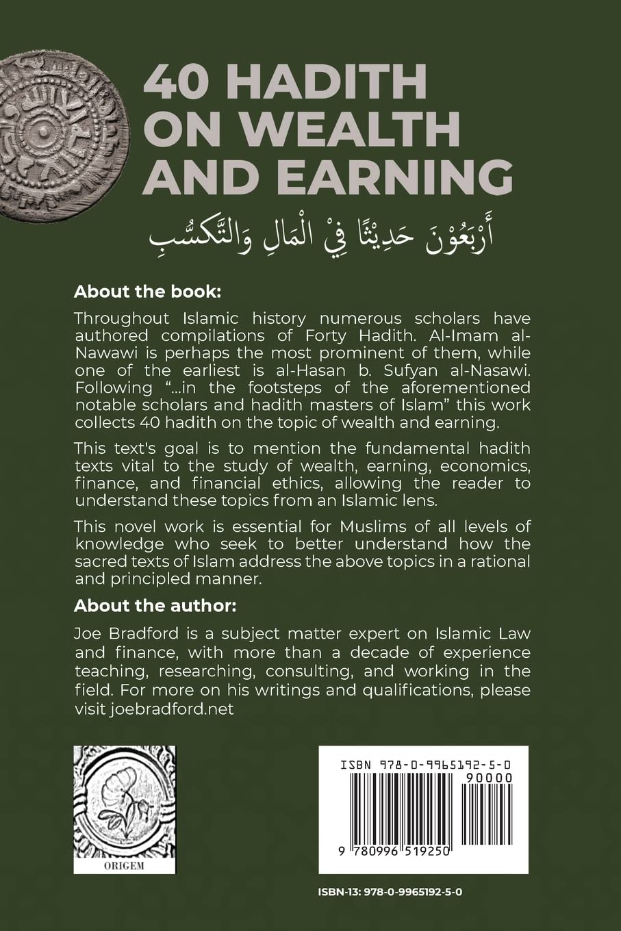 Throughout Islamic history numerous scholars have authored compilations of Forty Hadith. Al-Imam al- Nawawi is perhaps the most prominent of them, while one of the earliest is al-Hasan b. Sufyan al-Nasawi. Following “…in the footsteps of the aforementioned notable scholars and hadith masters of Islam” this work collects 40 hadith on the topic of wealth and earning. This text’s goal is to mention the fundamental texts through which concepts vital to the study of wealth, earning, economics, finance, and financial ethics will be introduced from an Islamic lens. This novel work is essential for Muslims of all levels of knowledge and aptitude seeking to better understand how the sacred texts of Islam address the above topics in a rational and principled manner.