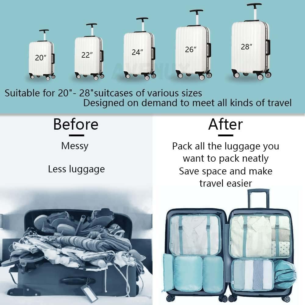 LUGGAGE COMPATIBILITY : Compatible with most travel bags, luggages, suitcases, backpacks, bagpacks, duffle bags. Can fit in 24-25 inch travel luggages. These packing organizers can make it easy for you to save space in your luggage/bag by classifying your belongings and keeping them from getting lost. This also makes security checks at the airport quick and convenient.