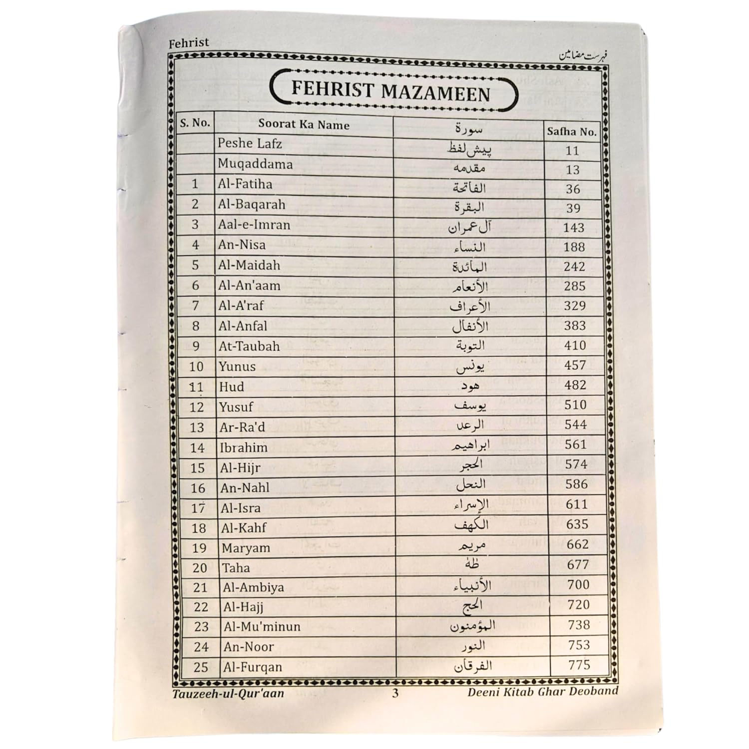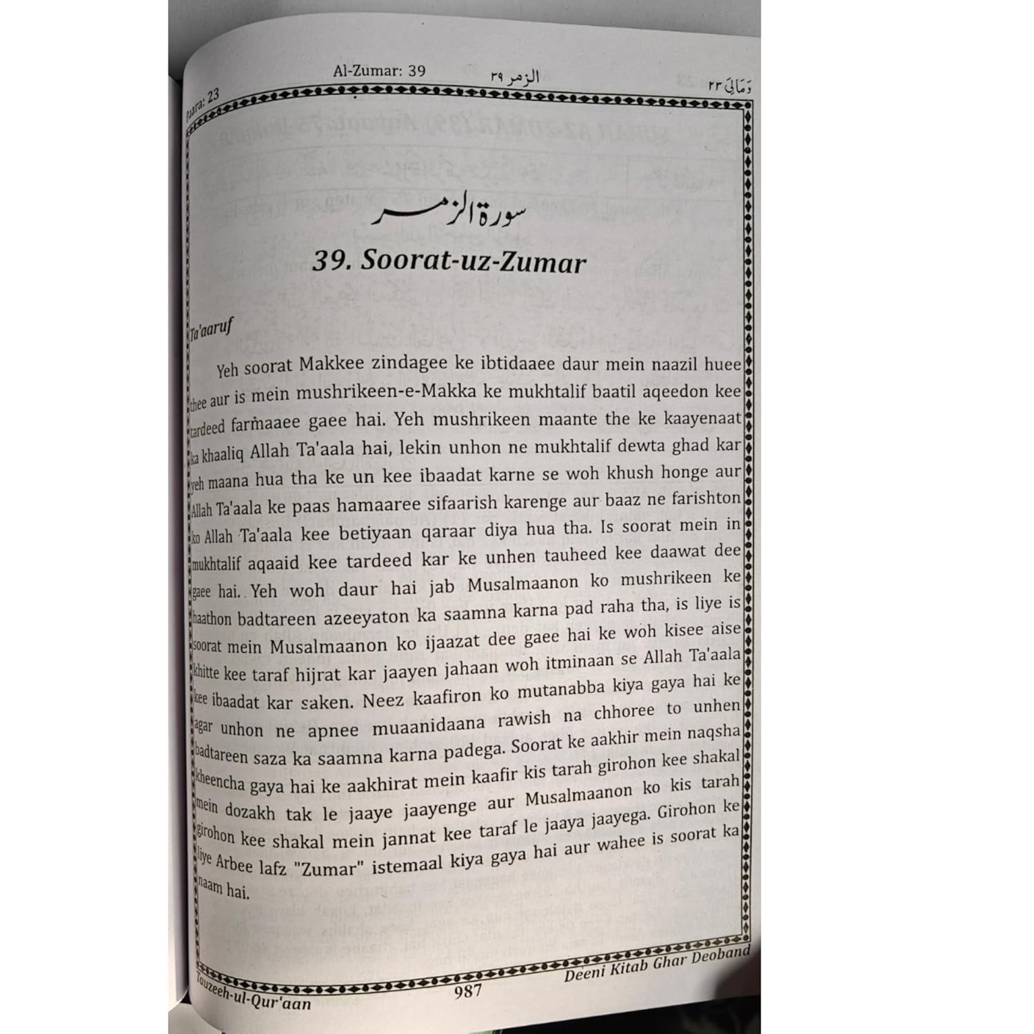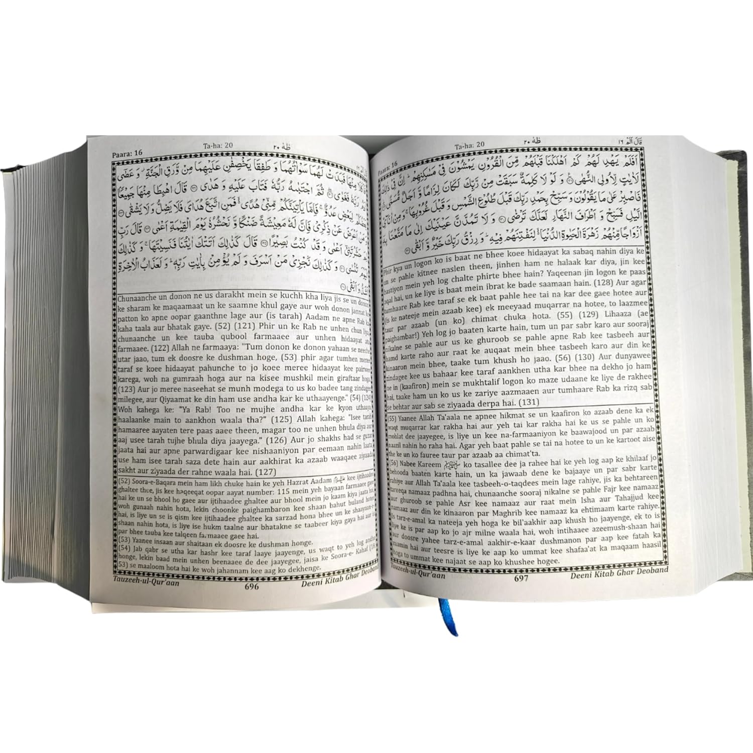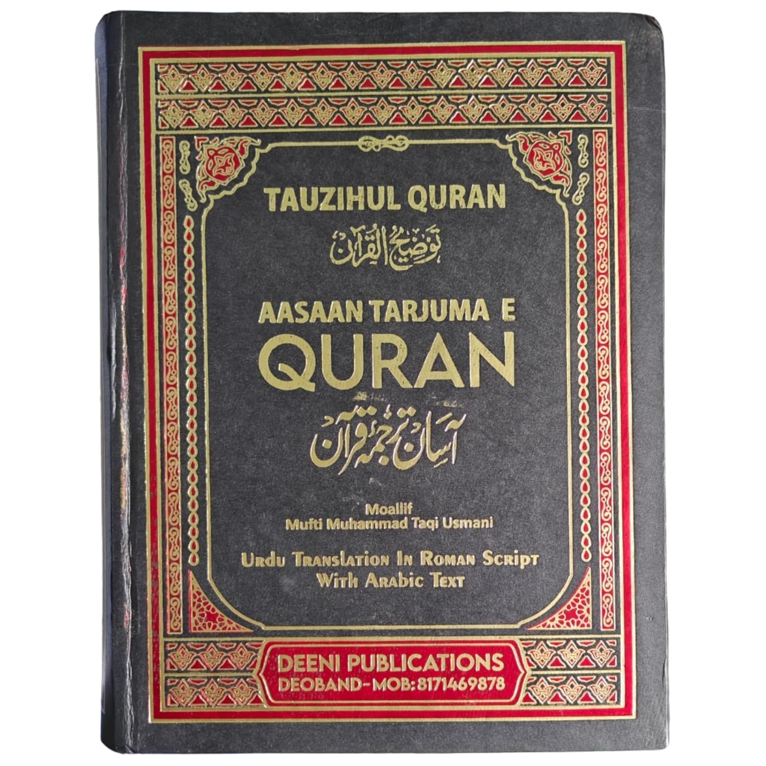 Tauzeehul Quran Quran-e-Kareem ke ma’ani ko asaan, ba-mahawara aur rawan andaaz mein pesh karne ki ek munfarid aur qabil-e-qadr koshish hai. Chunke Quran-e-Kareem ki be-misaal balaaghat aur taaseer ko kisi doosri zuban mein mukammal taur par muntaqil karna namumkin hai, is liye mutarjim ne is baat ka khaas ehtemam kiya hai ke tarjuma na to bilkul lafzi ho aur na hi itna azaad ke Quran ke alfaaz se door chala jaye. Jahan Quran ke alfaaz mein ek se zyada tafseeri imkanaat mojood hain, wahan koshish ki gayi hai ke tarjume mein bhi woh imkanaat baaqi rahen. Aur jahan ye mumkin na ho, wahan salaf ke nazdeek zyada rajih tafseer ko tarjeeh di gayi hai. Is ke saath hi mukhtasir tashreehi hawashi shaamil kiye gaye hain taake qari ko mushkil maqamaat par rehnumai mil sake, jabke lambe tafseeri mabahis se guraiz kiya gaya hai. Ye tashreehat mukhtalif mustanad kutub ke mutala’ se haasil shuda nichod hain. Mashhoor Aalim Ka Kaam: Duniya ke mashhoor Islami scholar, Mufti Taqi Usmani ki tasneef, jo gehrai aur asliyat ko yaqini banati hai. Asaan Quran Tarjuma: Quran ko Roman Urdu mein pesh karta hai, jo un logon ke liye asaan hai jo Urdu script nahi parh sakte. Ma’ni Khez Tashreeh: Har aayat ke behtareen samajh ke liye wazeh tashreehat aur context shaamil hain. Zubaan Ka Faasla Kam Karta Hai: Un parhne walon ke liye behtareen jo boli hui Urdu samajhte hain magar asri Urdu script nahi parh sakte. Bhrosa Mand aur Sahih: Ek mukhtaar resource, jo beginners aur advanced parhne walon dono ke liye Quran ke saath ek ma’ni khiz ta’alluq banane ke liye ideal hai.