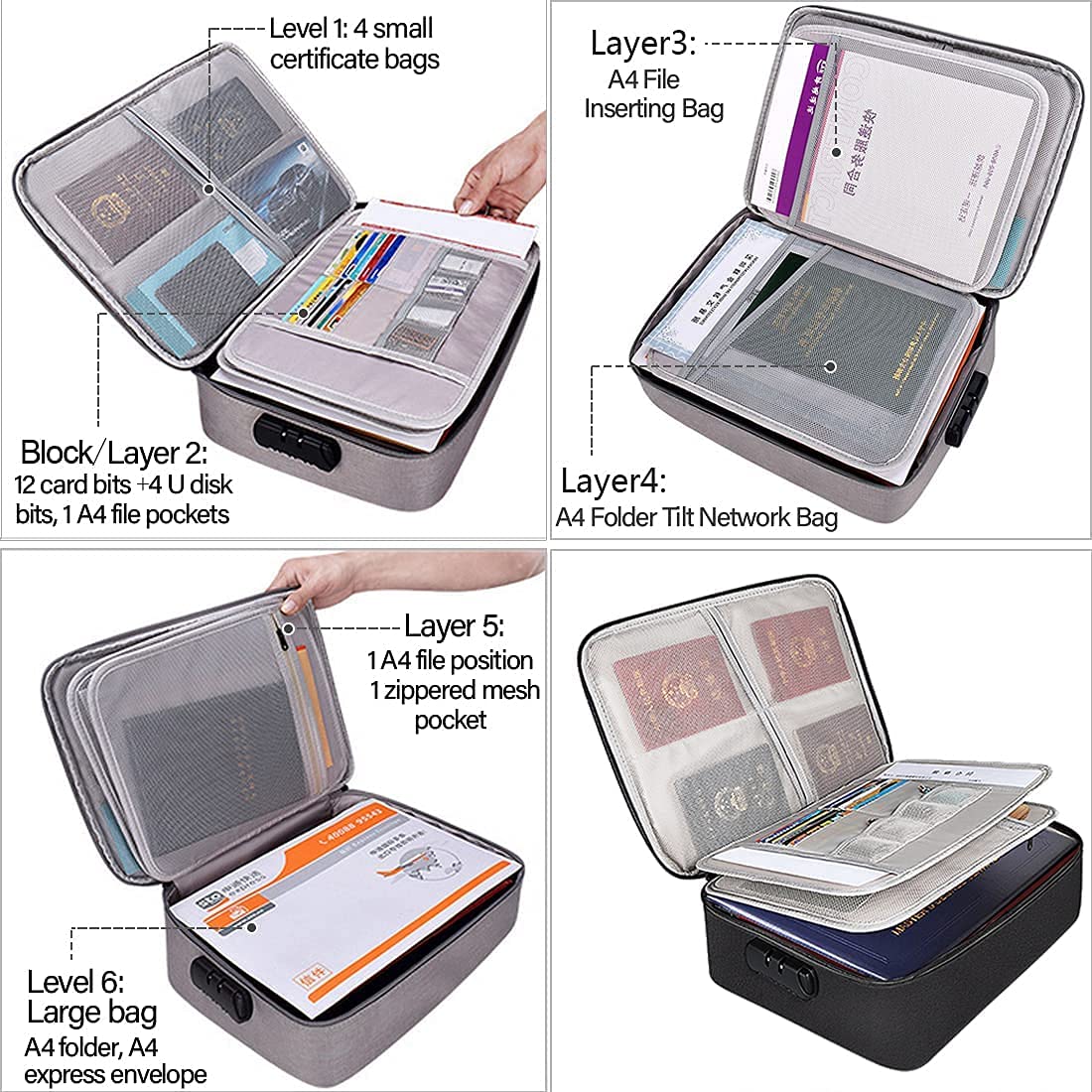 Agility Document Bag,Waterproof Oxford A4 Size 3-Layer Credential Bag, File Pocket with Safe Code Lock, Travel Bag with Separators (Black)