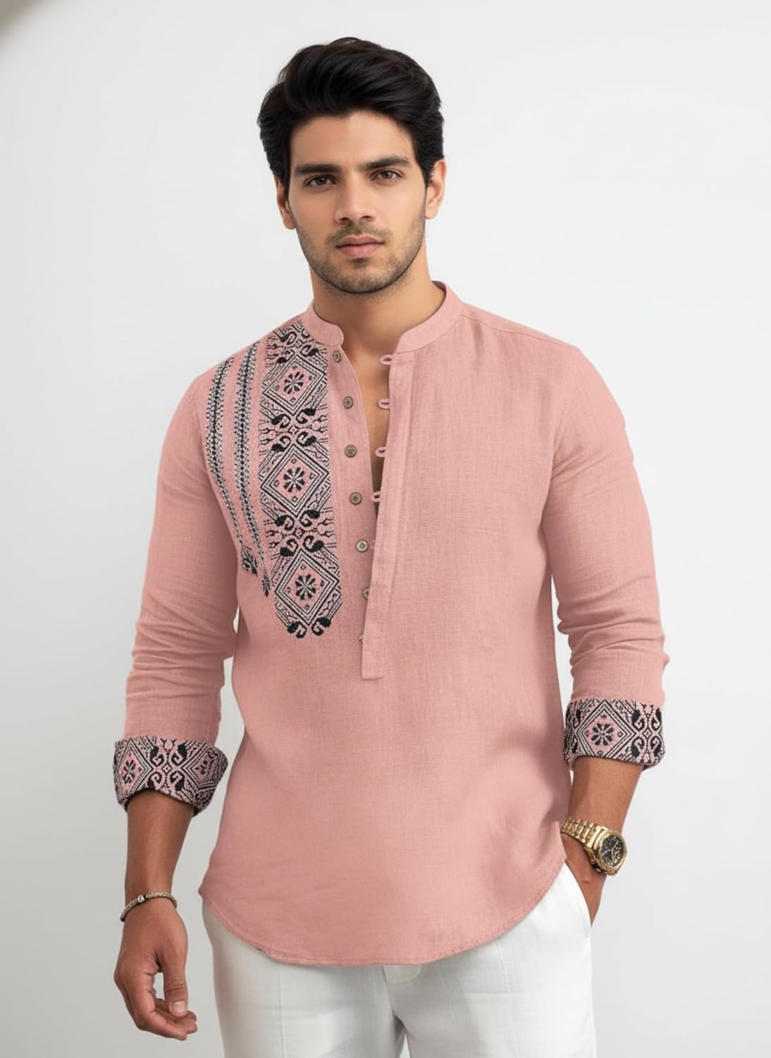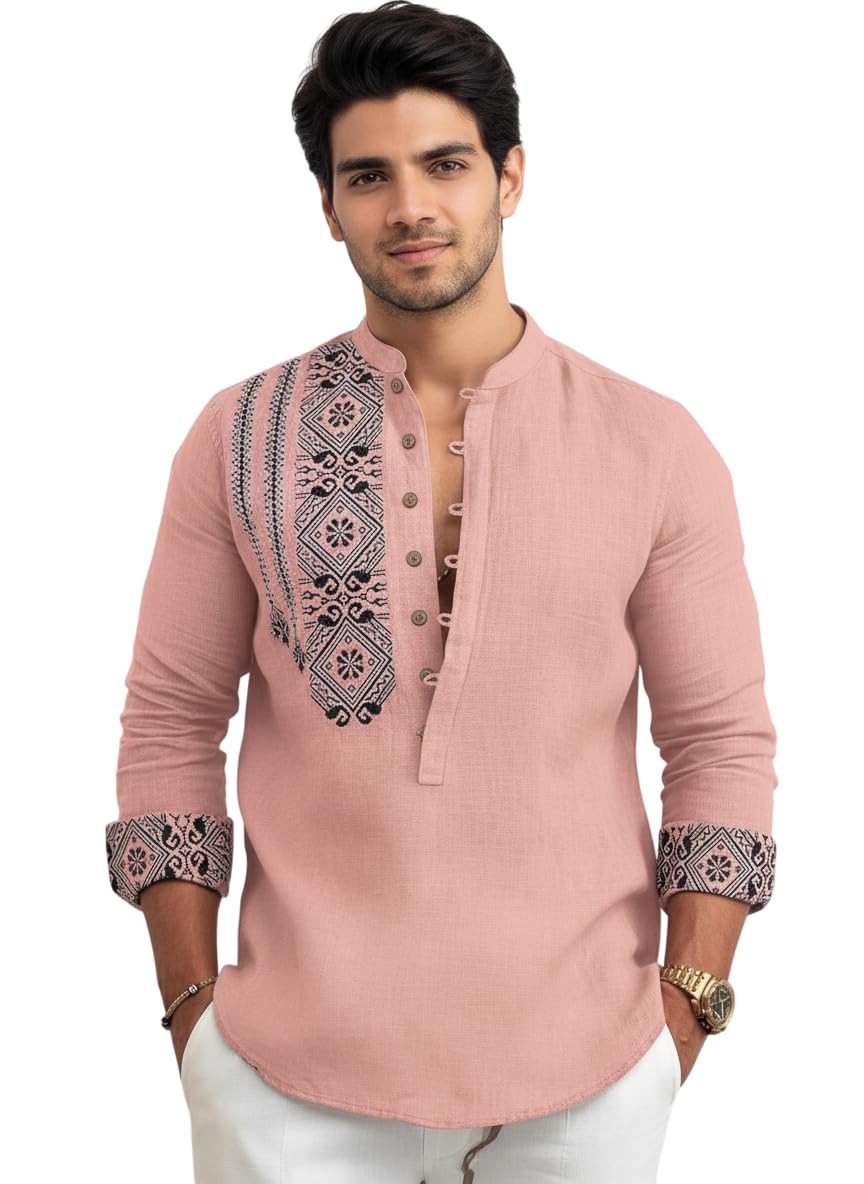 Amazon Brand – INKAST Men’s Cotton Blend Mandarin Collar Self One Design Full Sleeve Casual Short Kurta
