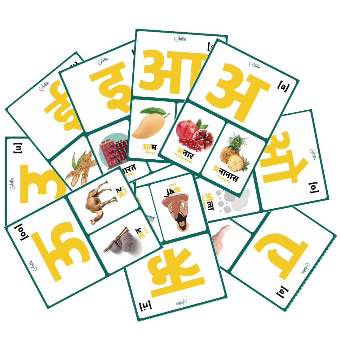 Sound Support for Each Akshar Each flashcard includes English pronunciation hints and audio support, making it easy for both kids and non-Hindi-speaking parents to teach effectively.