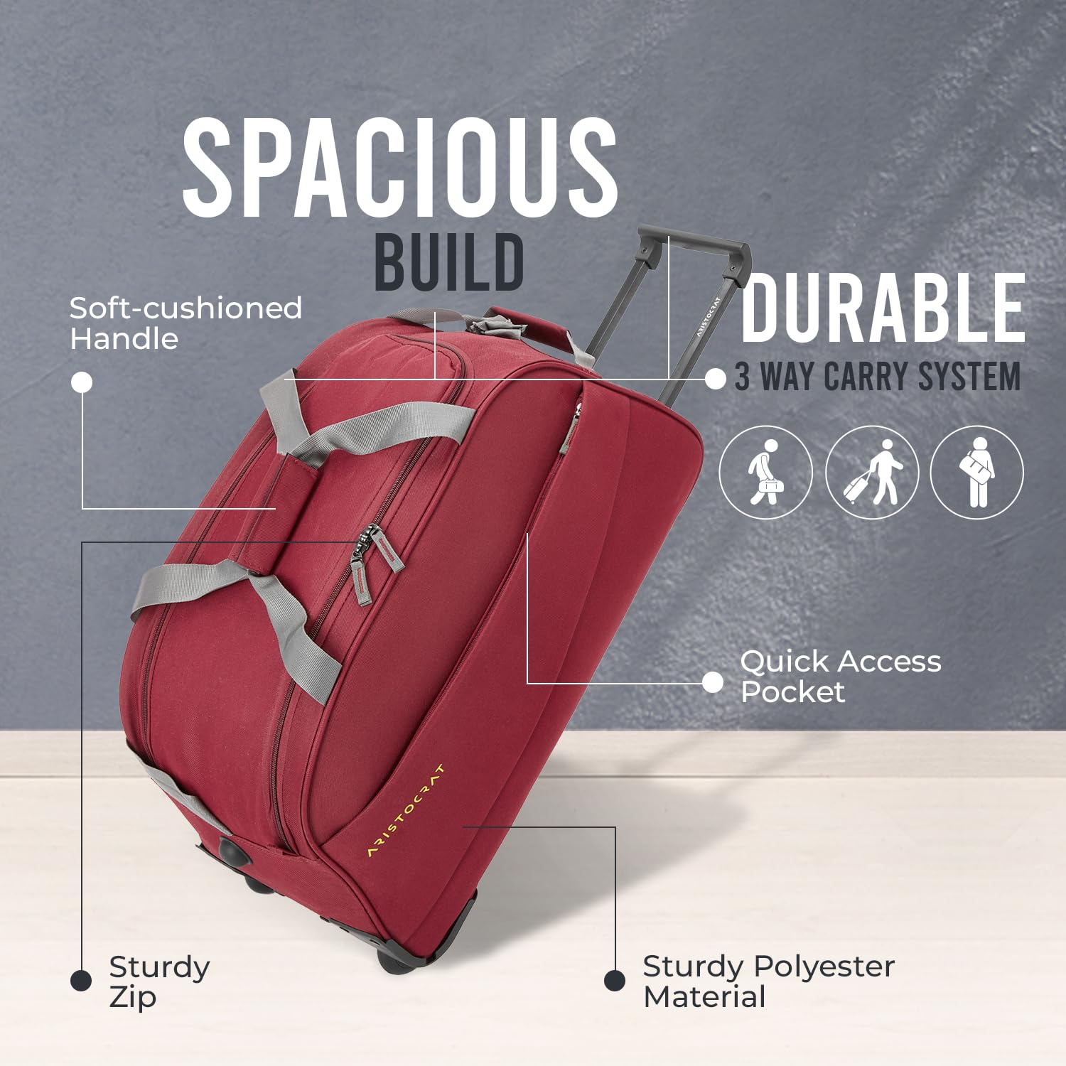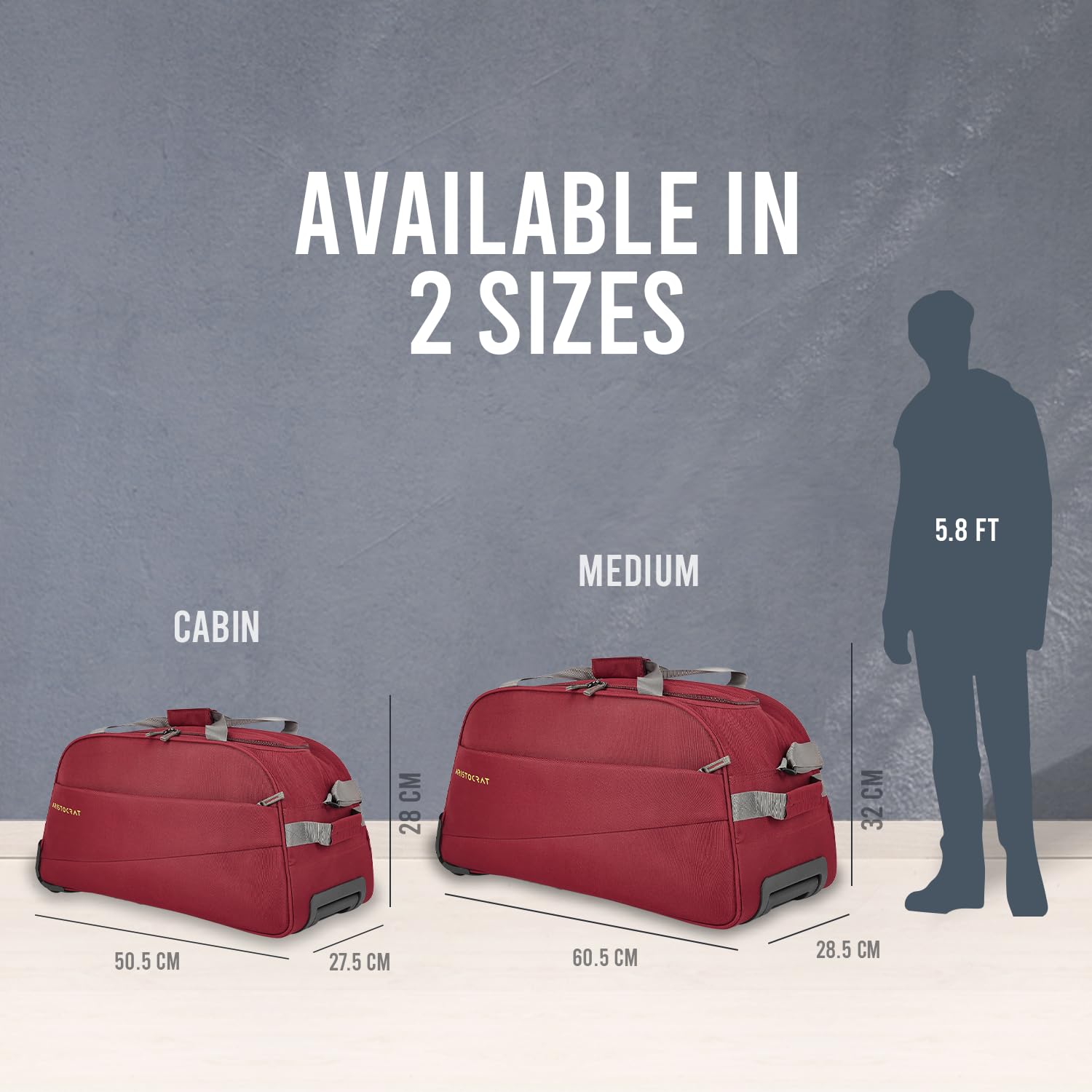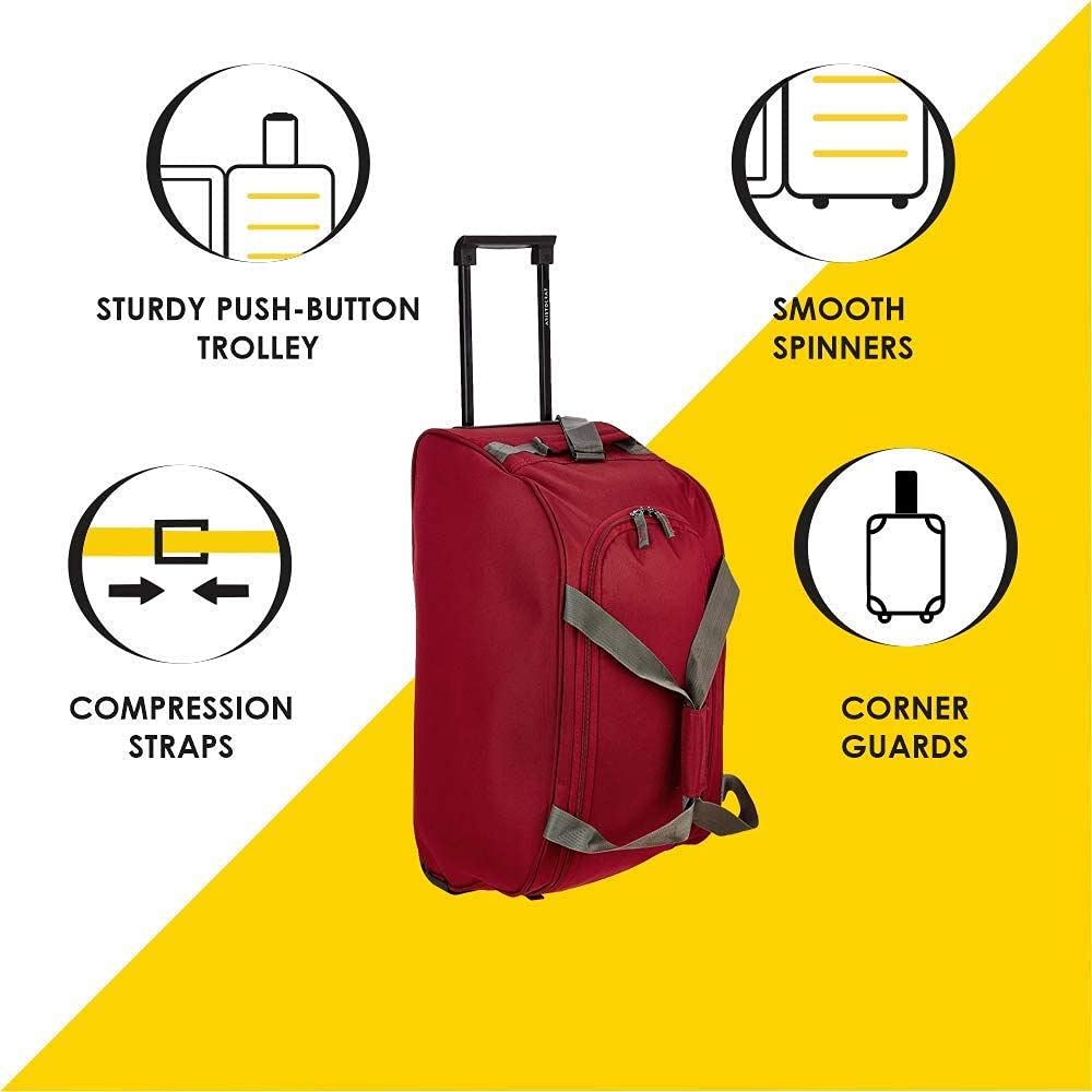 Stylish, spacious Aristocrat Red travel duffle trolley. Aristocrat Luggage has had a remarkable journey of creating durable luggage which stretches over decades. Changing times and demand have led to a significant evolution in what we create and how we understand the Indian traveller. Now part of VIP Industries Limited, Aristocrat caters to the young Indian who strives to follow his heart. A young India, where the ambitions are big, the dreams even bigger. Aristocrat wants to partner young Indians along the journey of ‘unpacking their dreams’. Our collection is a range of modern and functional products crafted to suit the varying needs of the aspirational youth of the country. Leading the pack with more space and durability, Aristocrat has a bag for every need and occasion. We offer backpacks, hard/soft luggage uprights, duffel trolleys, office bags, overnighters, suitcases and briefcases.