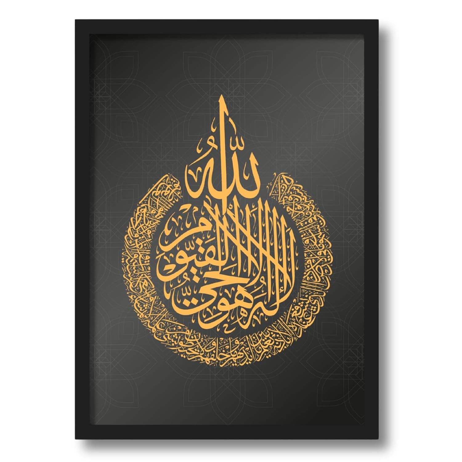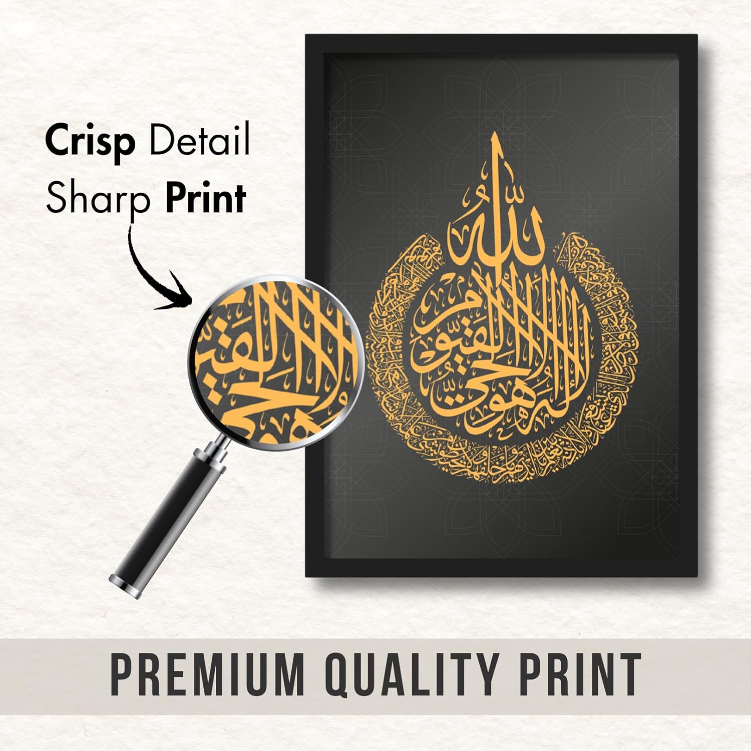 AYATUL KURSI WALL FRAME: ArtAction Ayatul Kursi Arabic Calligraphy Wall Frame Poster in A4 size (31×23 cm) featuring elegant golden calligraphy on a deep black background