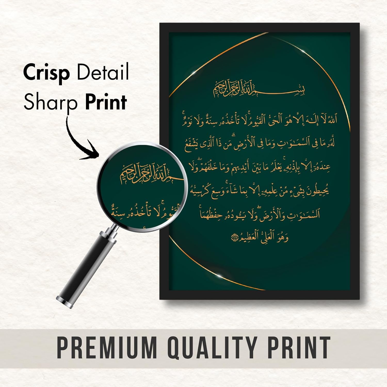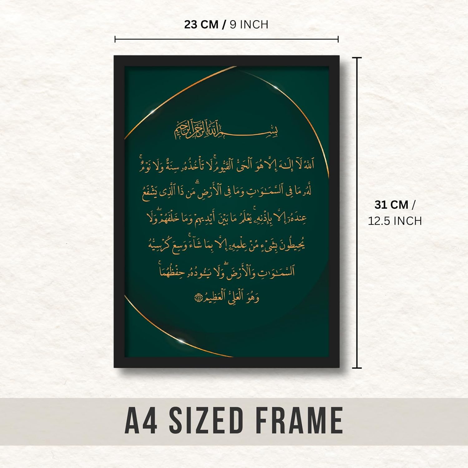Elevate your home décor with the ArtAction Ayatul Kursi Arabic Calligraphy Wall Frame Poster, a stunning representation of one of the most cherished Quranic verses. This A4-sized framed art (31×23 cm) features beautifully designed Arabic calligraphy in rich gold tones over a deep emerald background, symbolizing peace, protection, and faith. The elegant composition blends spirituality with sophisticated design, making it perfect for prayer corners, bedrooms, living areas, or offices. Built from durable synthetic wood with a 0.5-inch minimalistic frame, it brings both strength and refinement to your walls. The crisp high-resolution print is safeguarded by clear plexiglass for clarity and lasting beauty. Each ArtAction Wall Frame Poster is carefully inspected and securely packed after a quality check, ensuring it reaches you in perfect condition. A meaningful piece that reflects Islamic heritage, serenity, and grace — this frame is also a thoughtful gift choice for housewarmings, Eid, or personal milestones.