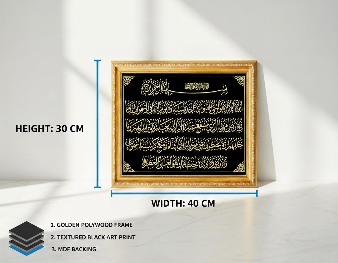 Ayat-ul-Kursi Islamic Wall Art Frame, Arabic Calligraphy with Golden Frame, Black Background