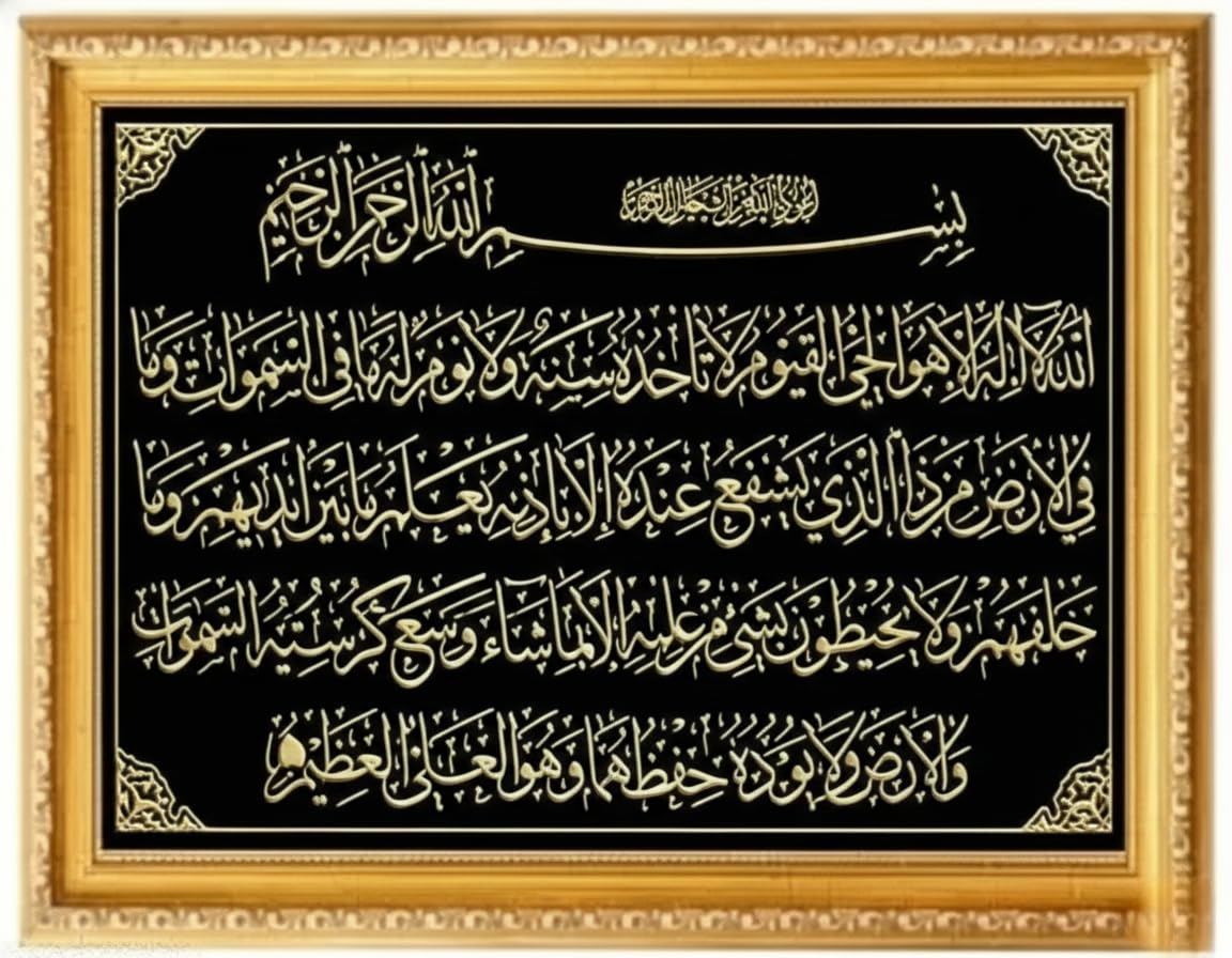 Islamic Wall Art: Features Ayat-ul-Kursi, one of the most powerful verses from the Holy Quran, beautifully rendered in traditional Arabic calligraphy on a black background