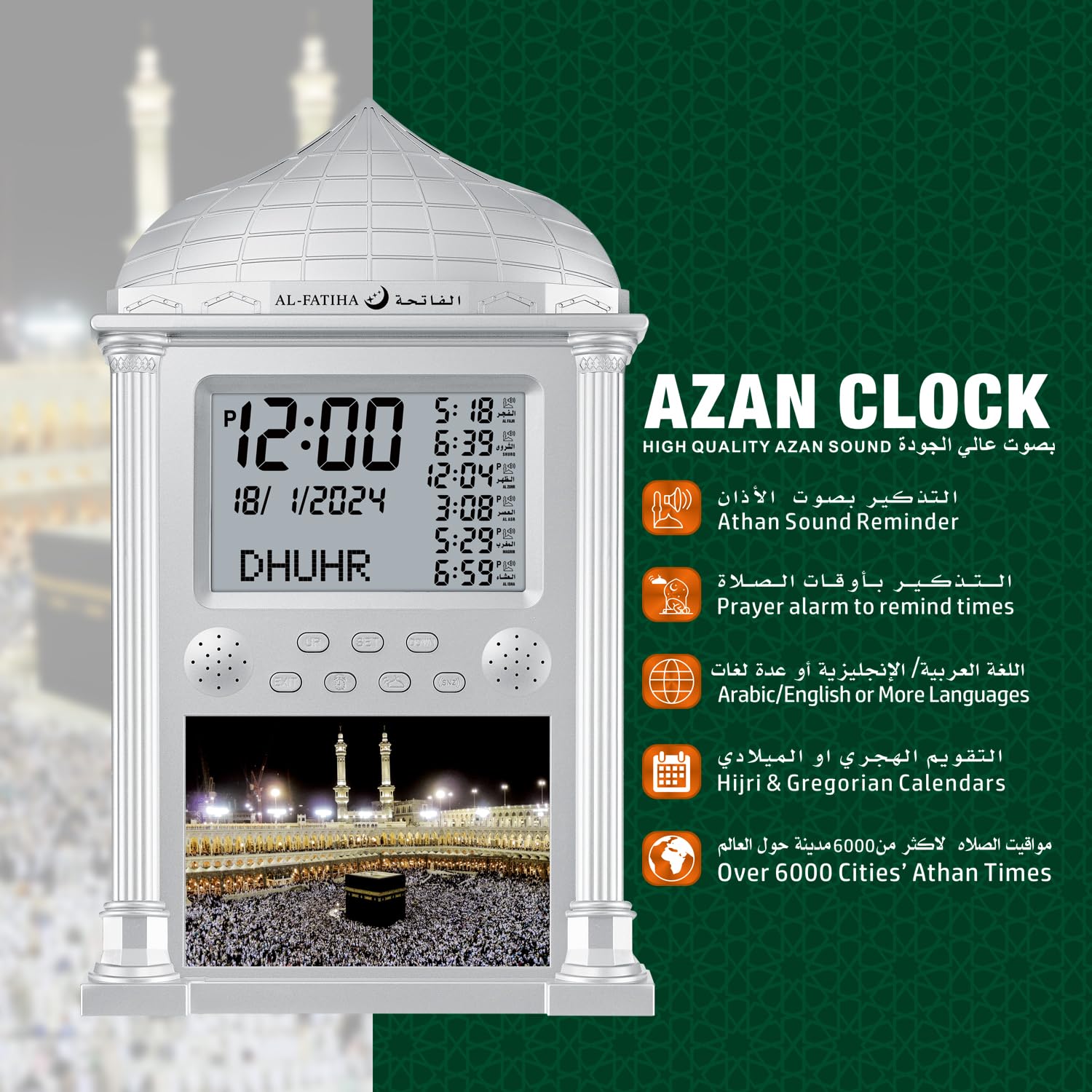 【Prayer Reminder】 Azan clock with a high quality azan sound for all prayers with azan volume control fitted in all clock models.