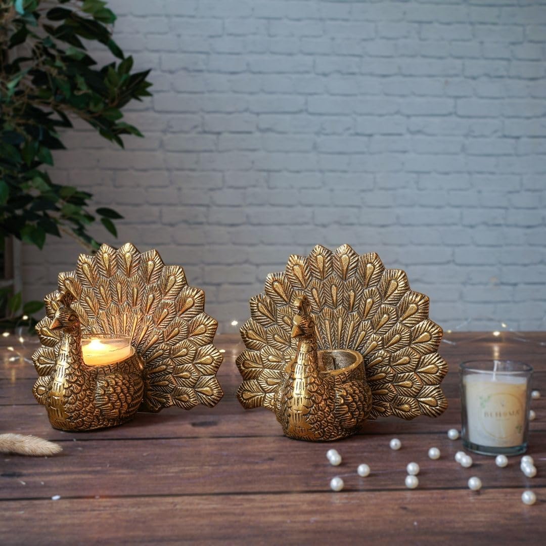 BEHOMA Aluminium Dancing Peacock Figurine Pair for Love & Good Luck | Home Décor Tabletop Showpiece with Scented Votive Candles | Valentine, Anniversary & Wedding Gift for Couples | Set of 2, Gold