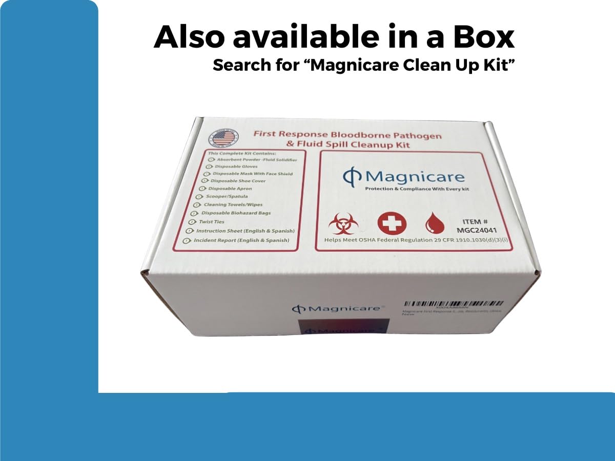 First Response Spill Kit IN A BAG The enhanced First Response Spill Kit is expertly designed for the comprehensive management of bodily fluid spills, making it a critical asset for ensuring workplace safety and compliance with OSHA Regulation 29 CFR 1910.1030(d)(3)(i). This kit is equipped with high-quality, disposable tools and personal protective equipment, including absorbent powder, gloves, masks with face shields, shoe covers, aprons, and a scraper, along with clean-up towels (wipes) for thorough cleanups which helps avoid any direct contact with the fluid spill. It features a disposable biohazard bag with twist ties for safe waste containment. The bloodborne pathogen kit includes bilingual instructions in English and Spanish, ensuring accessibility and ease of use across diverse workforces. An incident report form is provided to document spills accurately, enhancing safety protocols. Ideal for a wide range of settings such as restaurants, schools, and public areas, this kit is the ultimate solution for maintaining cleanliness and health standards making it an ideal bodily fluid clean up kit.