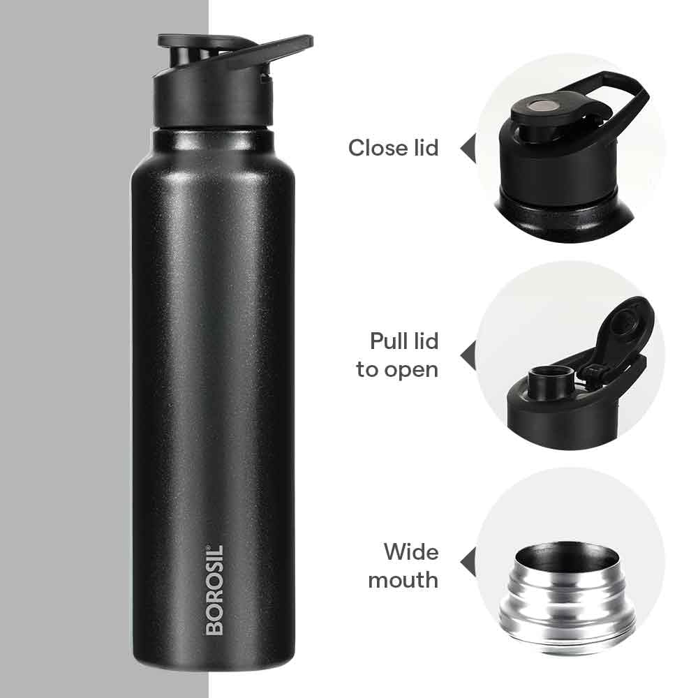 Borosil 840 ml Hydra Sipfresh Galaxy Stainless Steel Water Bottle | ISI Certified, Made in India | Single Wall, Leakproof| Bottle for Office, School, College & Gym | 1 Year Warranty | Black