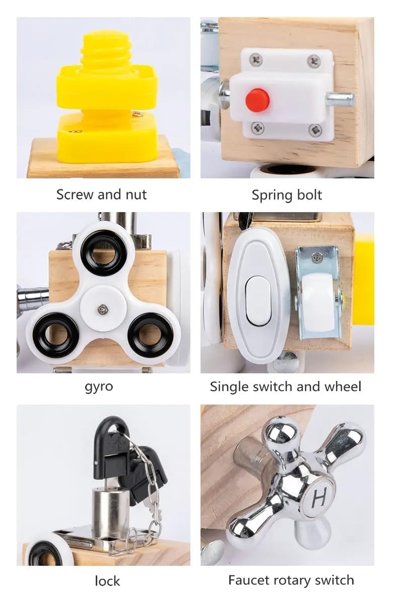 This 7-in-1 activity cube is packed with diverse sensory activities designed to engage little hands and curious minds. From clicking switches, flipping locks, and twisting gears to sliding beads and spinning wheels, each element promotes different skill sets. These activities help with sensory development, problem-solving, and logical thinking, making this toy a complete learning tool for toddlers.