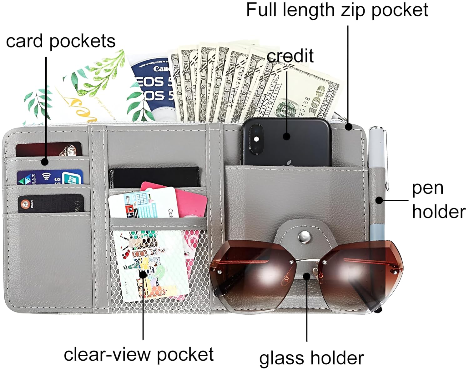 Increased SafetyHaving quick access to essentials like your driver’s license, insurance card, or sunglasses can reduce distractions while driving. This organizer allows you to store and access your essentials without the need to search through glove compartments or center consoles, keeping your focus on the road.Enhanced OrganizationWith its multiple compartments, the Car Sun Visor Organizer helps you declutter your car, ensuring everything has its designated place. No more loose papers or scattered items around your car. The organizer ensures that everything you need is right where it should be, making your car feel cleaner and more organized.Convenient for TravelThe Car Sun Visor Organizer is an ideal accessory for frequent travelers. It keeps your essential travel documents, such as your passport, boarding passes, and tickets, within easy reach while keeping them secure. Whether you’re heading to the airport or taking a road trip, this organizer ensures that your documents are neatly stored and easily accessible.Space-SavingTraditional car organizers often take up valuable seat or floor space, but the Car Sun Visor Organizer makes use of an underutilized area—your sun visor. By utilizing this space, you save room in your car and keep your essentials within reach without cluttering your car’s interior.Stylish and PracticalNot only does this organizer keep your items neat and organized, but it also adds a touch of style to your car’s interior. The sleek PU leather design blends seamlessly with most car interiors, providing both practicality and style in one simple accessory.Affordable SolutionThe Car Sun Visor Organizer offers an affordable solution to car organization. For a reasonable price, you get a multi-pocket storage unit that can make a big difference in how organized your car feels. It’s a small investment that can help you avoid the frustration of a cluttered and disorganized car.