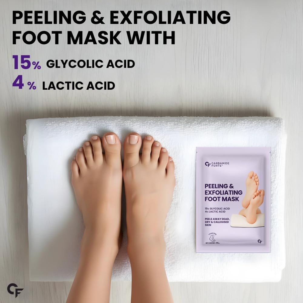 Carbamide Forte Peeling & Exfoliating Foot Peel off Mask for Dry & Calloused Feet | Foot peeling mask With 15% Glycolic Acid, 4% Lactic Acid & Aloe Vera | Helps Remove Dead Skin, Soften Cracked Heels & Calluses | 1 Pair (40g)