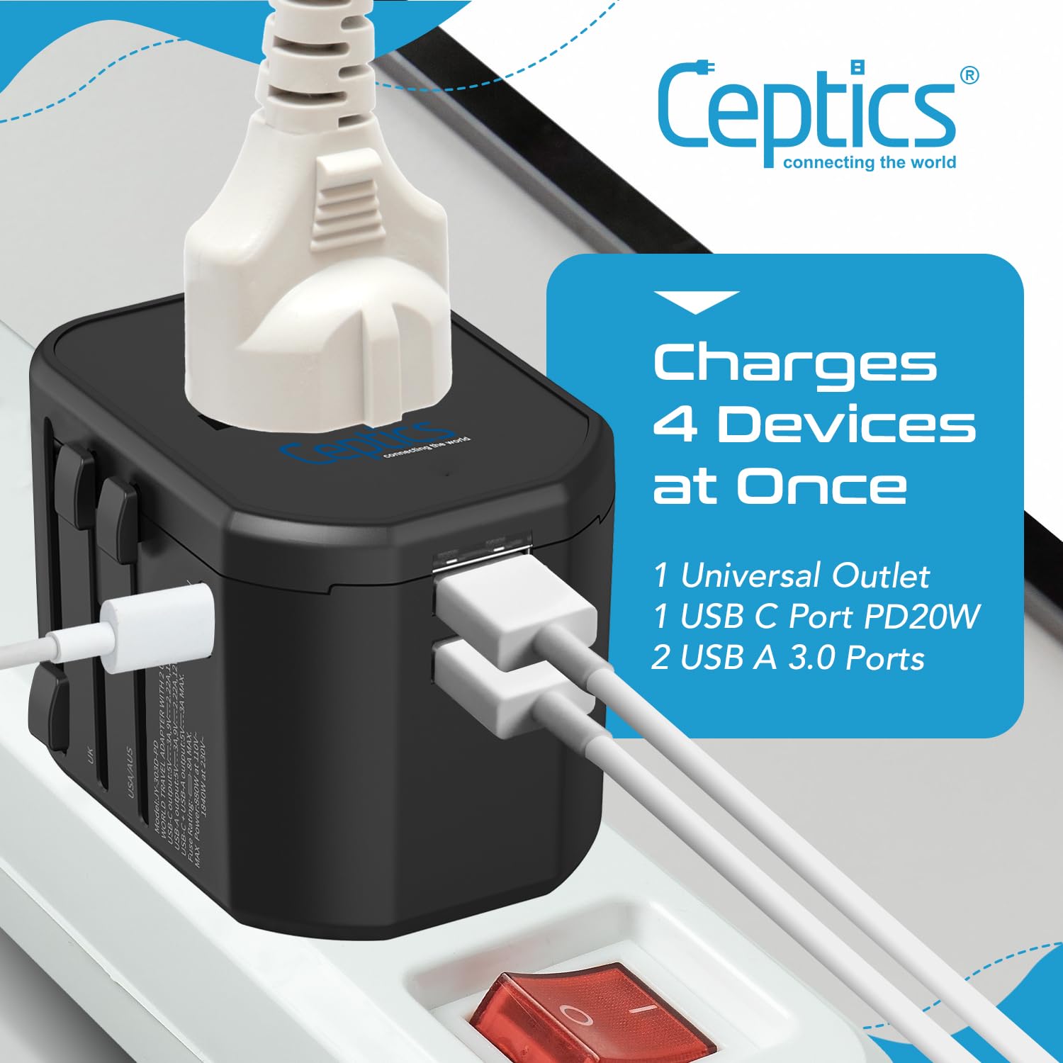 Ceptics 4 in 1 Universal Charger Adapter, 2 USB QC 3.0, 20W USB-C Universal Travel Adapter All in One Fast Charging, International Travel Adapter Lifetime Limited Warranty, for EU, UK, USA/AUS, Black