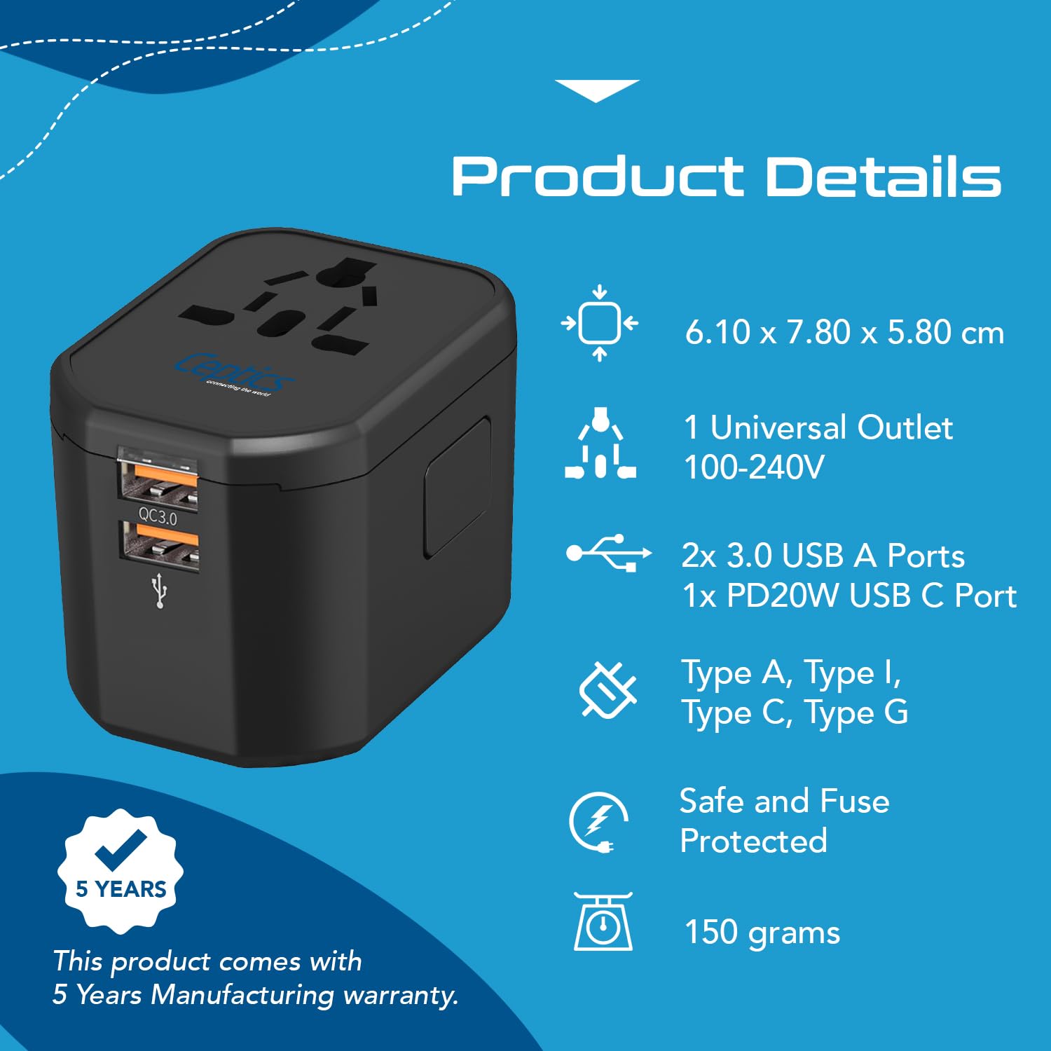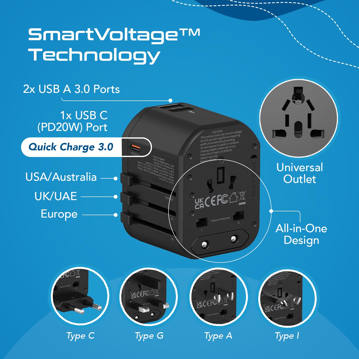 Type A C G I output – Type A can be used for Japan United States Canada Mexico Type I international travel power adapter for China Australia New Zealand/Type C European adapter plugs for Europe South America Asia Type G universal power adapter for United Kingdom Ireland Singapore Hong Kong.