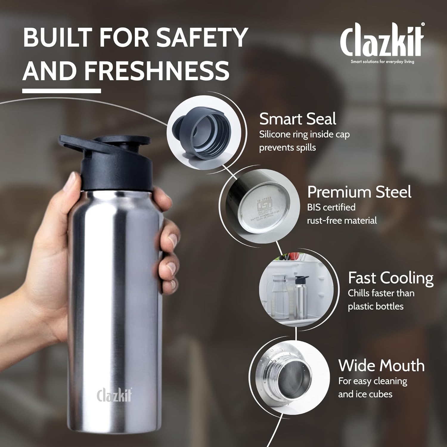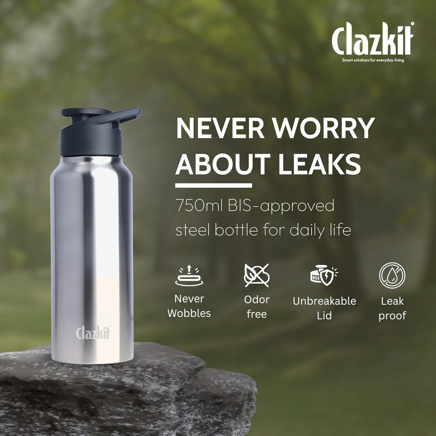 Clazkit Amaze 750ml Sporty Stainless Steel Water Bottle |ISI Certified |Leakproof, Rust-Free, BPA-Free, Durable for College, Fridge, Sports, Gym, Yoga & Office – Easy to Clean & Reusable