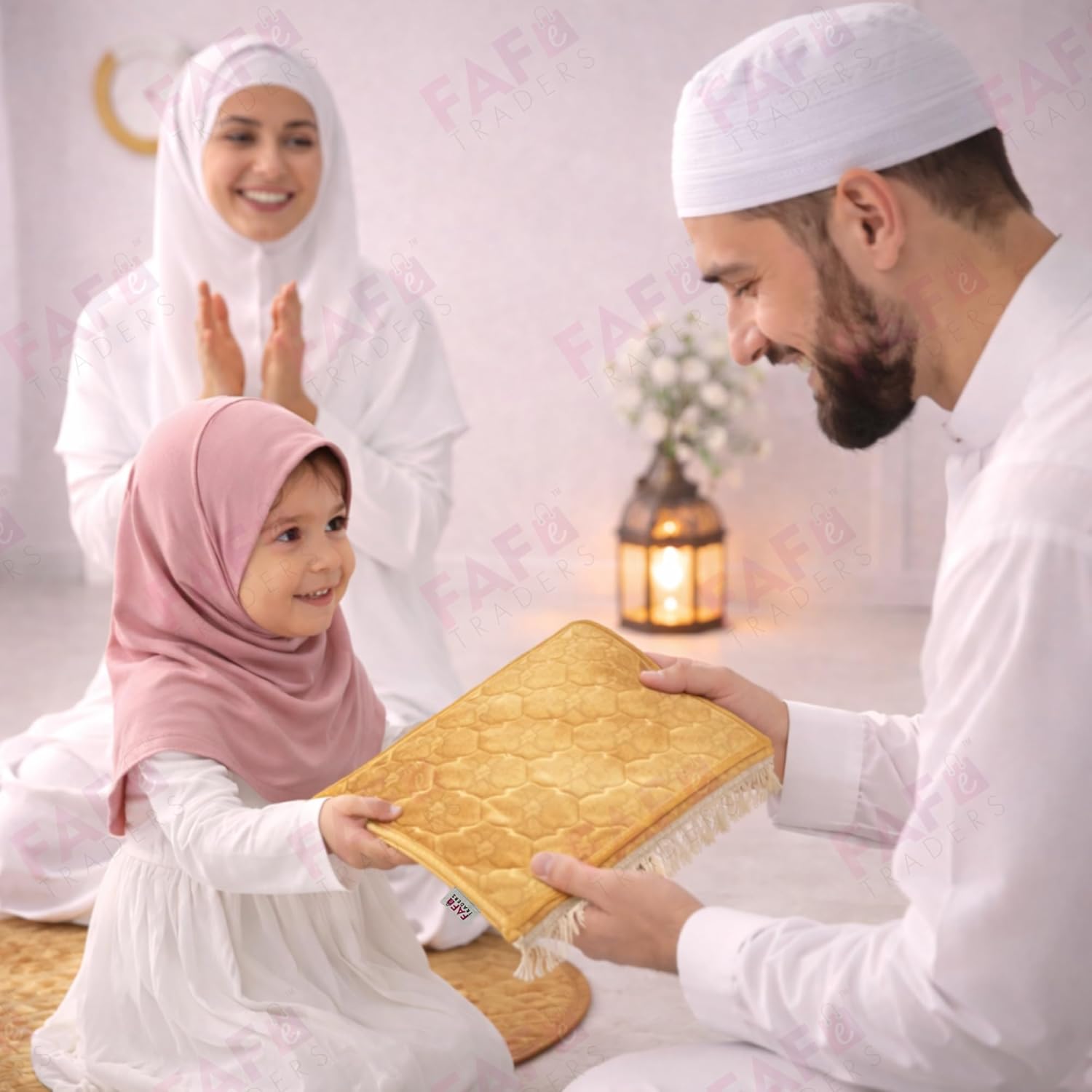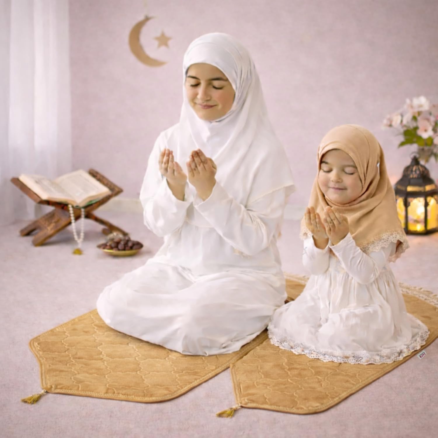 Ideal for Ramzan, Eid & Daily Prayer A meaningful choice for Ramzan, Eid, Islamic learning and daily namaz. This kids and adult janamaz combo is suitable for home prayer rooms, masjid use and family worship.
