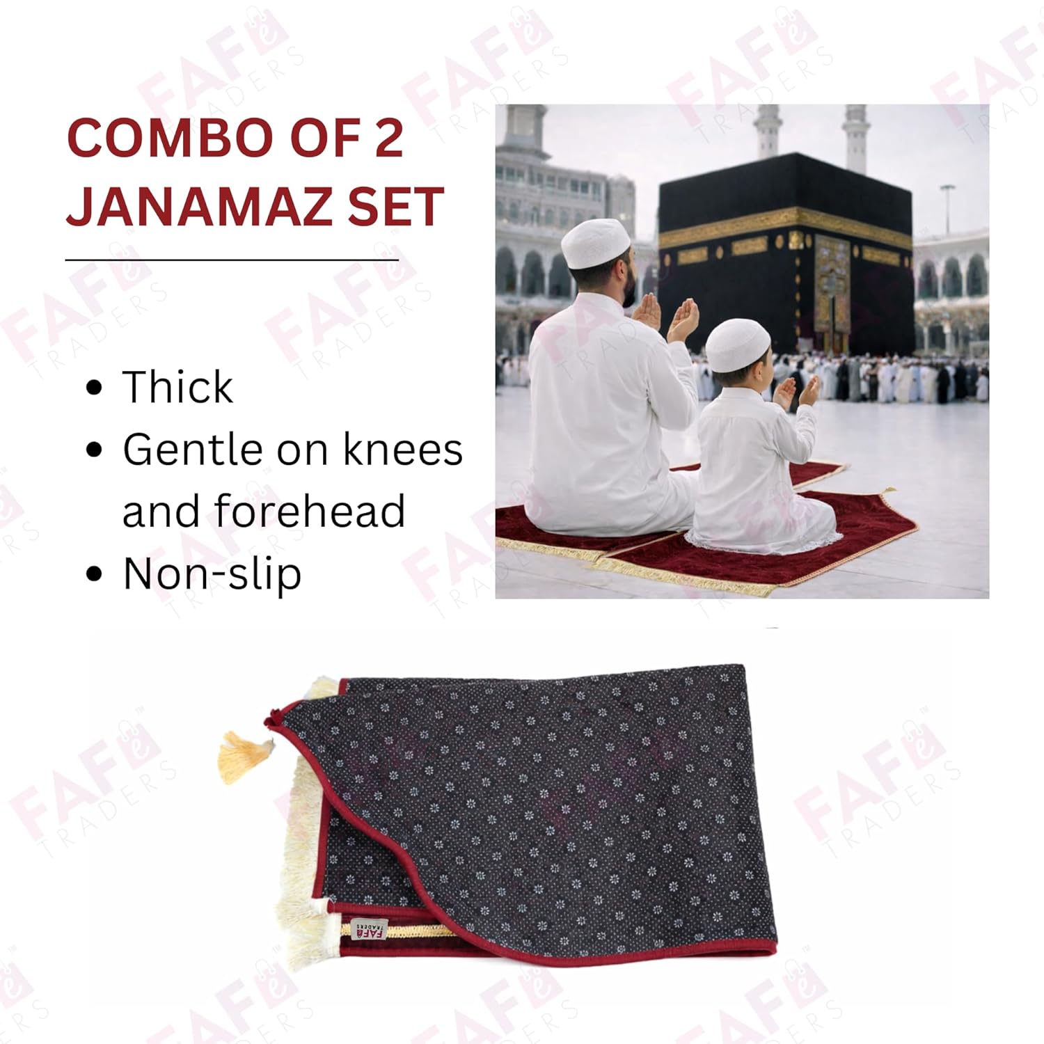 Ideal for Ramzan, Eid & Daily Prayer A meaningful choice for Ramzan, Eid, Islamic learning and daily namaz. This kids and adult janamaz combo is suitable for home prayer rooms, masjid use and family worship.