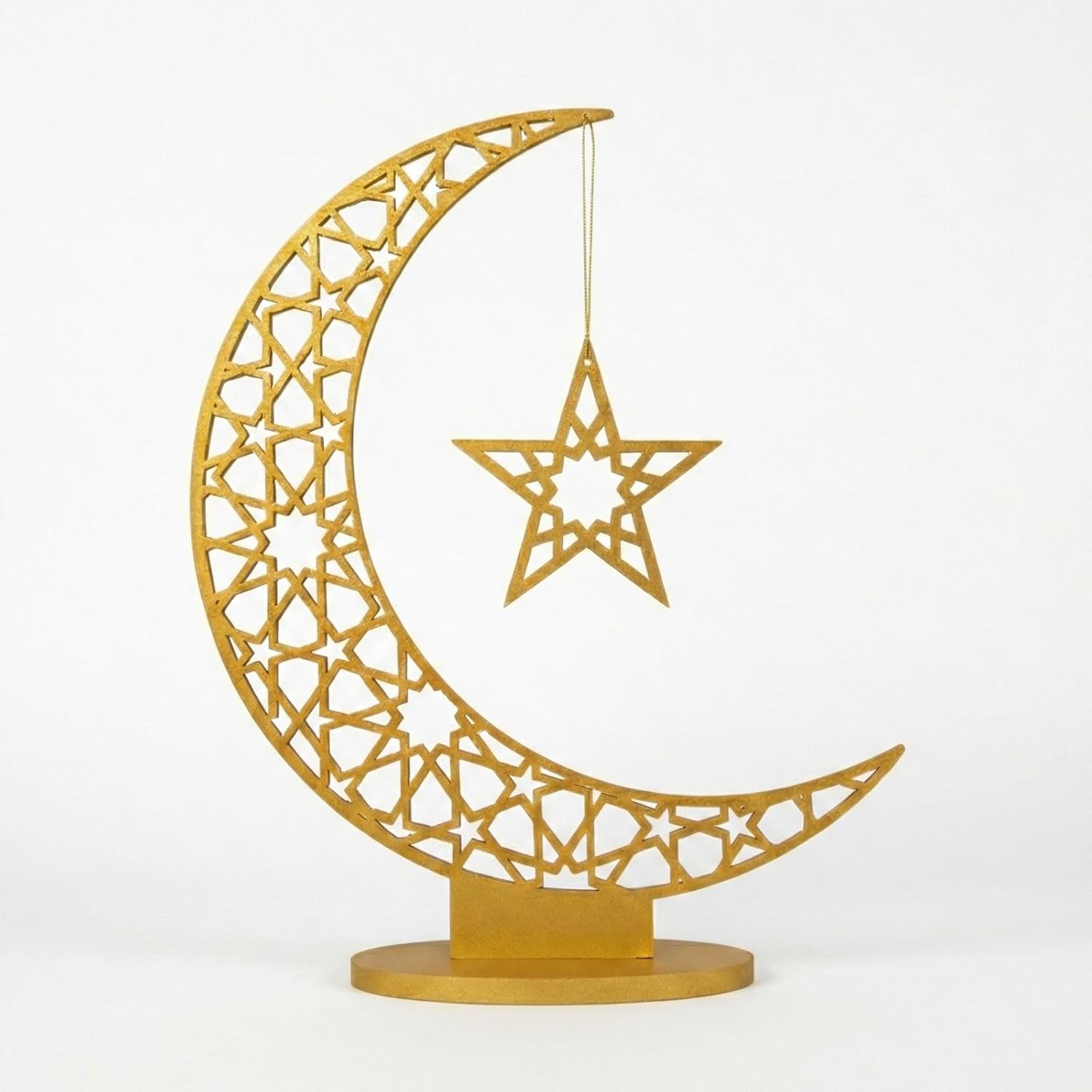Crescent Moon with Hanging Star Table Decor, 30 x 24 cm, 5mm MDF Gold Glitter Finish, Ramadan Table Decor, Eid Decoration, Islamic Home Decor Centerpiece