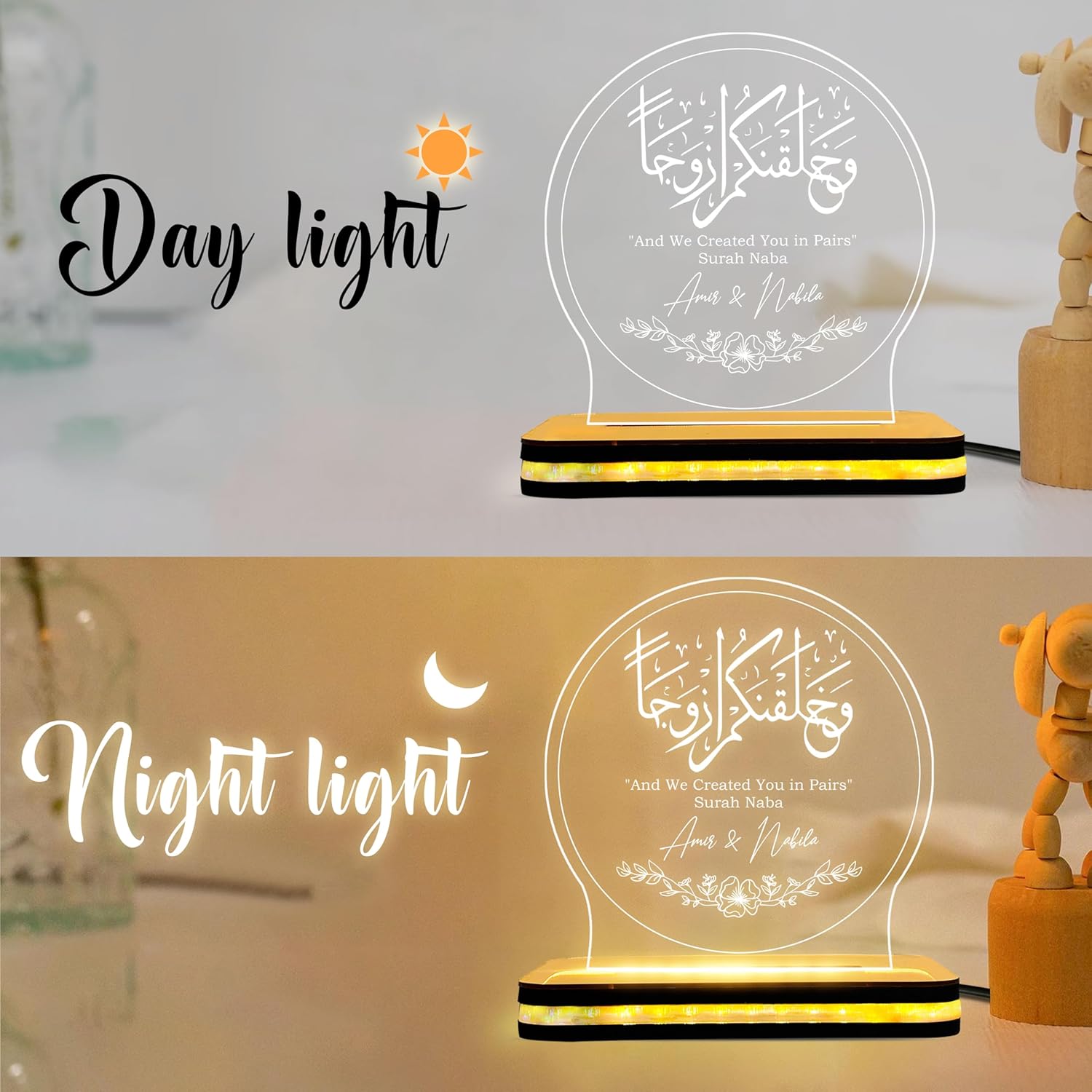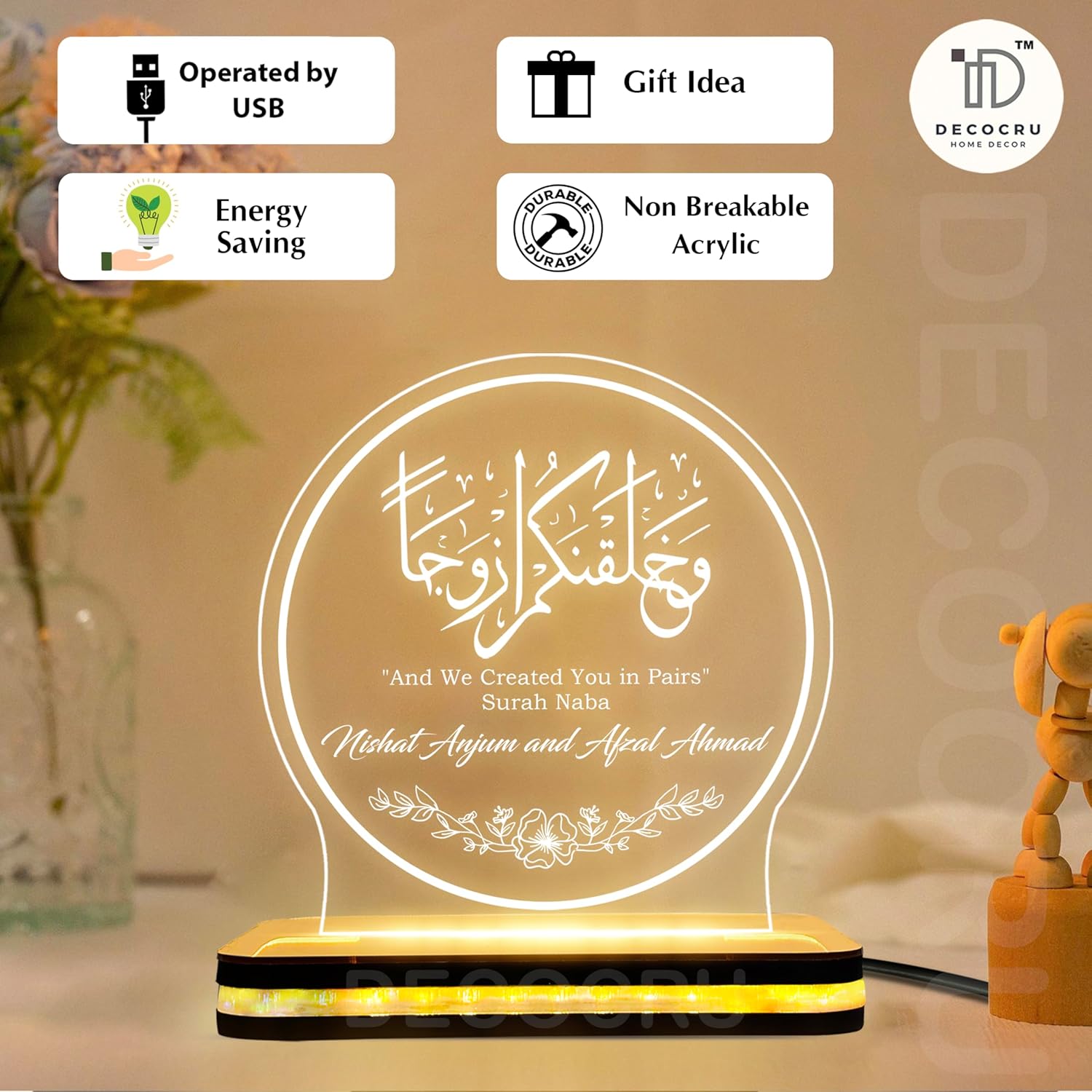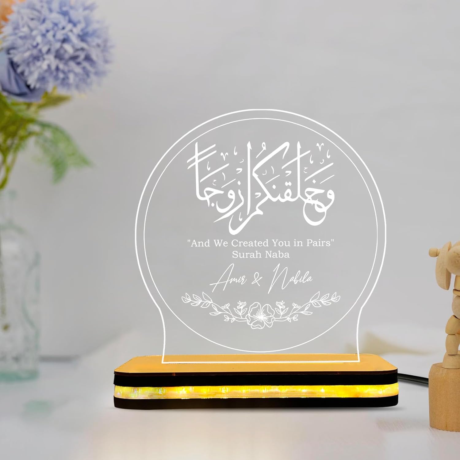 Fully Personalized: You can customize this lamp with the couple’s names and their special wedding or engagement date.Meaningful Design: Features the beautiful Quranic verse “And We Created You in Pairs” (78:8), making it a spiritual and romantic keepsake.High-Quality Materials: Made with a clear, durable acrylic plate and a premium natural wooden base that looks elegant in any home.Soft Warm Glow: The gentle LED light creates a cozy and peaceful atmosphere. It is perfect as a night lamp for the bedroom or a decor piece for the living room.The Perfect Gift: A thoughtful and unique gift choice for Nikkah, weddings, anniversaries, Valentine’s Day, or housewarming parties.