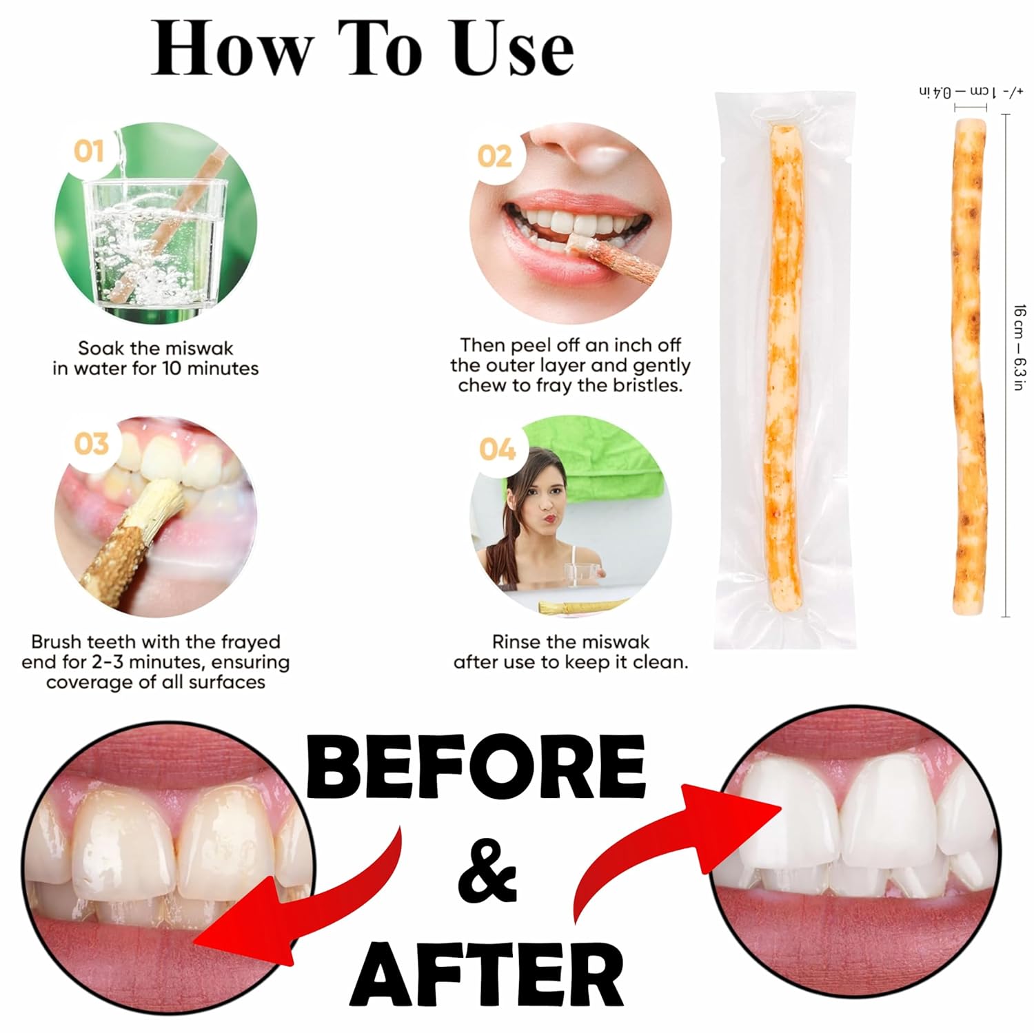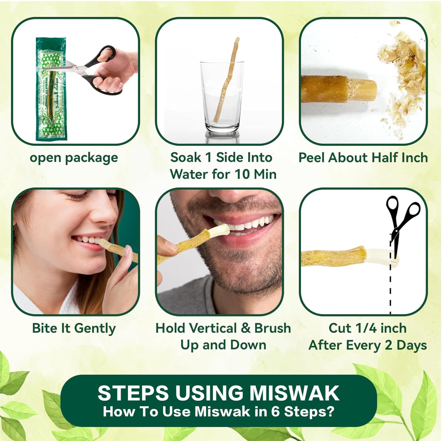 🧘 Ayurvedic & Sunnah-Inspired Oral Care Used traditionally in Ayurveda and Unani systems and recommended in Sunnah practices, Miswak is a time-tested, holistic approach to maintaining dental hygiene naturally. ✂️ Easy to Use & Travel Friendly Simply cut the tip, chew to form soft bristles, and brush. No water, no toothpaste required — making it perfect for travel, office, fasting, camping, or daily routine.