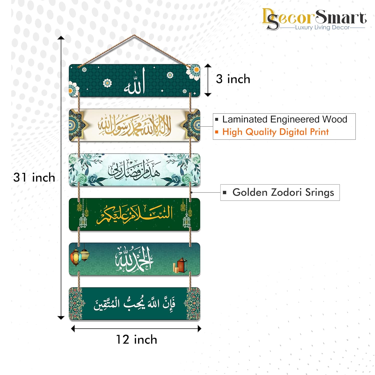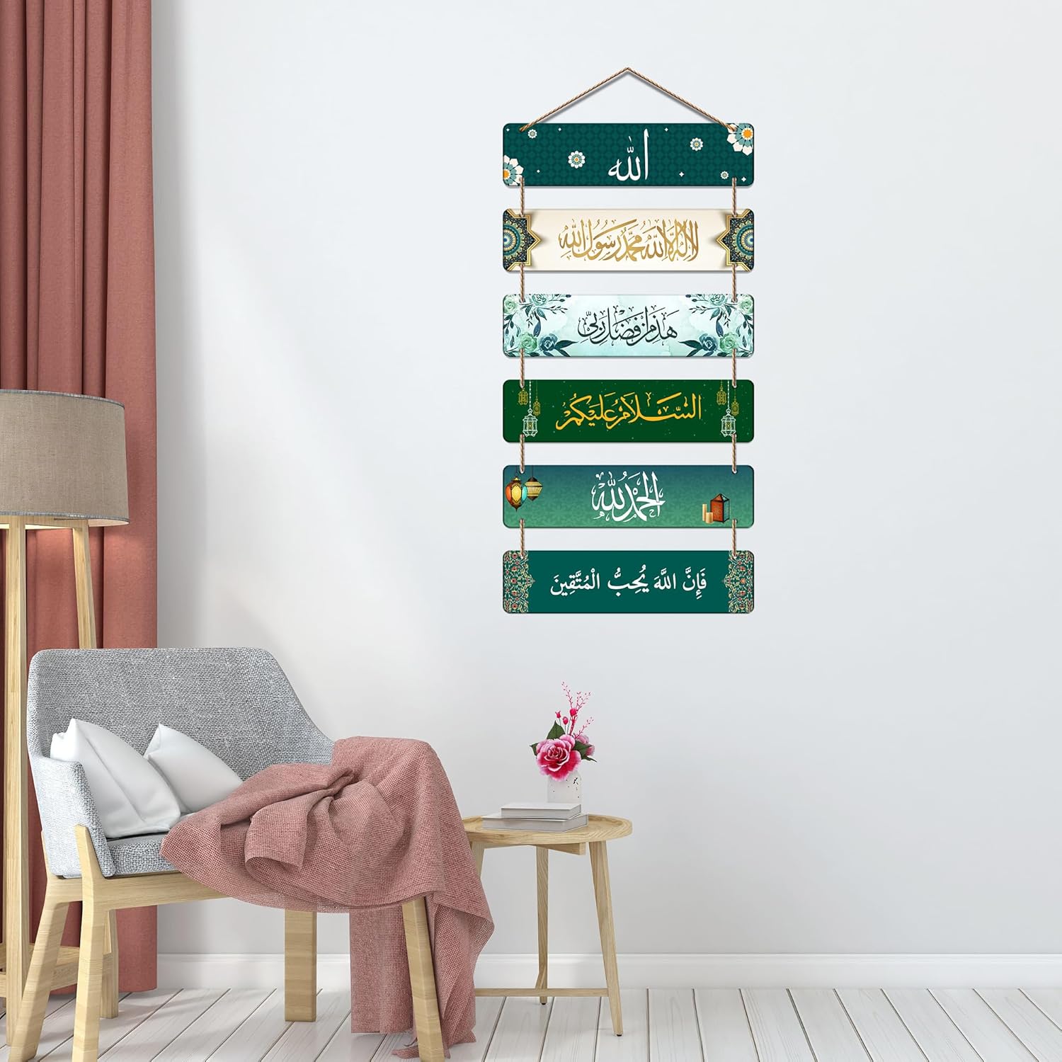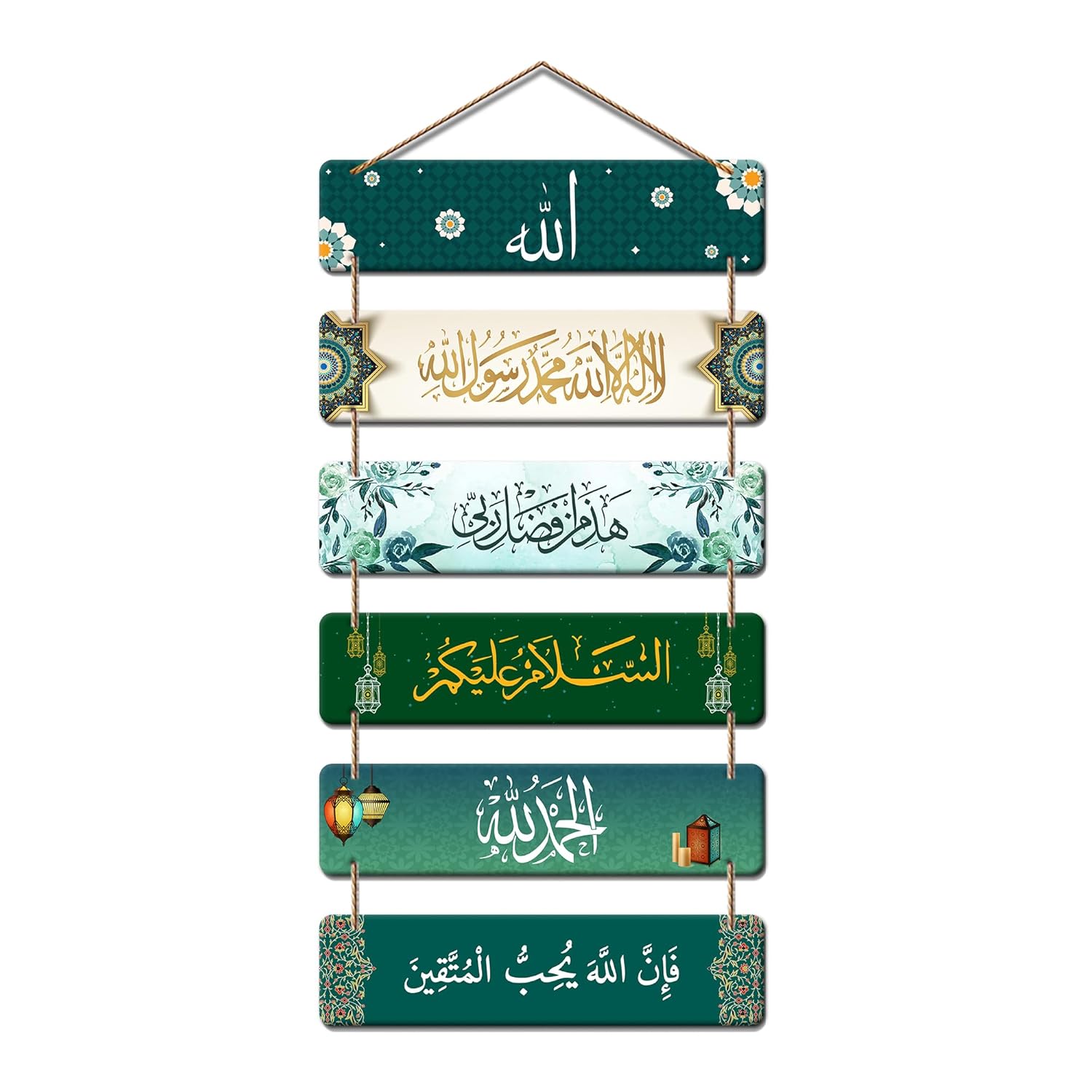Enhance your home with spiritual beauty using this exquisite Islamic Calligraphy Hanging Wall Decor. Featuring six interconnected panels adorned with rich greens, floral motifs, and lantern accents, each plank beautifully showcases meaningful Arabic phrases that inspire peace, faith, and gratitude. The natural rope ties add a handcrafted, rustic charm, making it perfect for living rooms, prayer areas, entryways, or study spaces. This tasteful décor piece serves as a gentle reminder of divine blessings and tranquility.