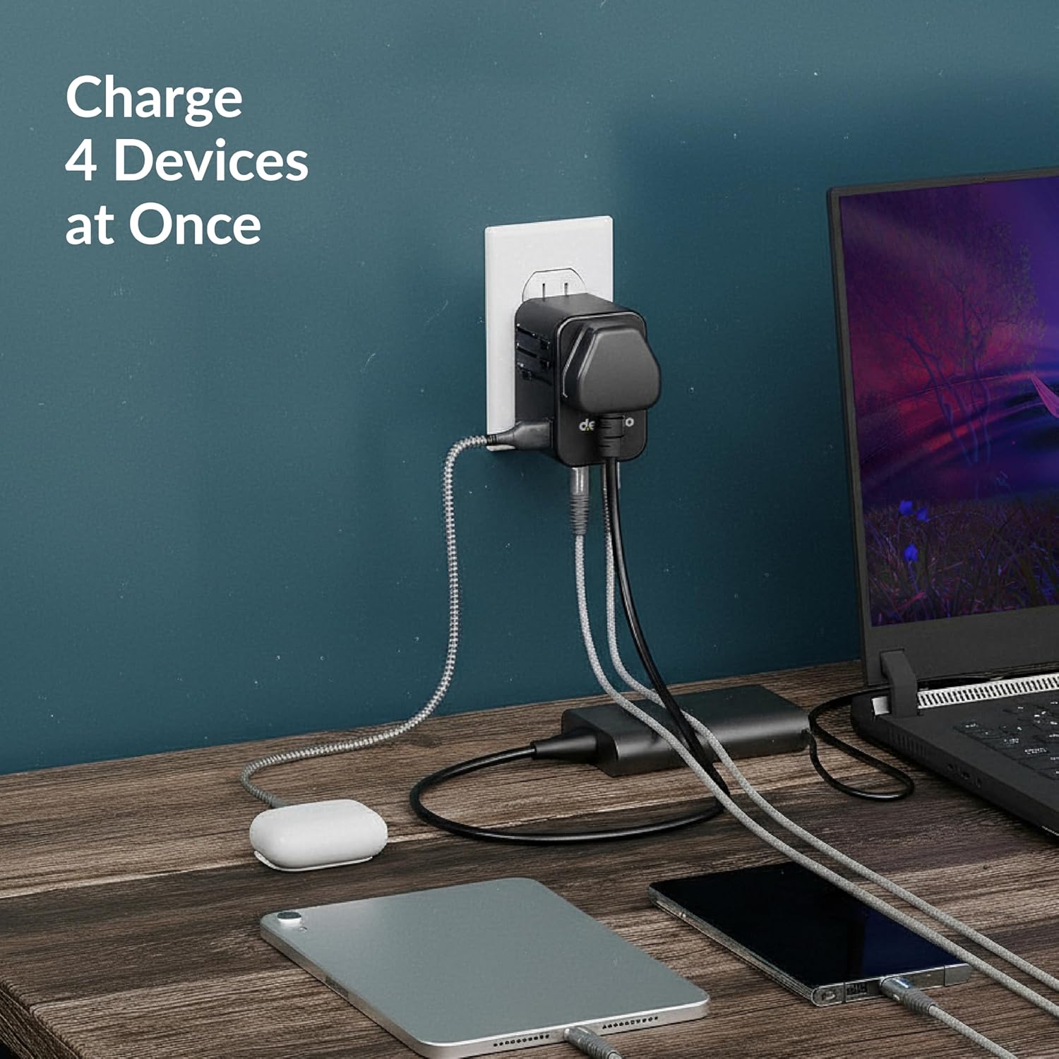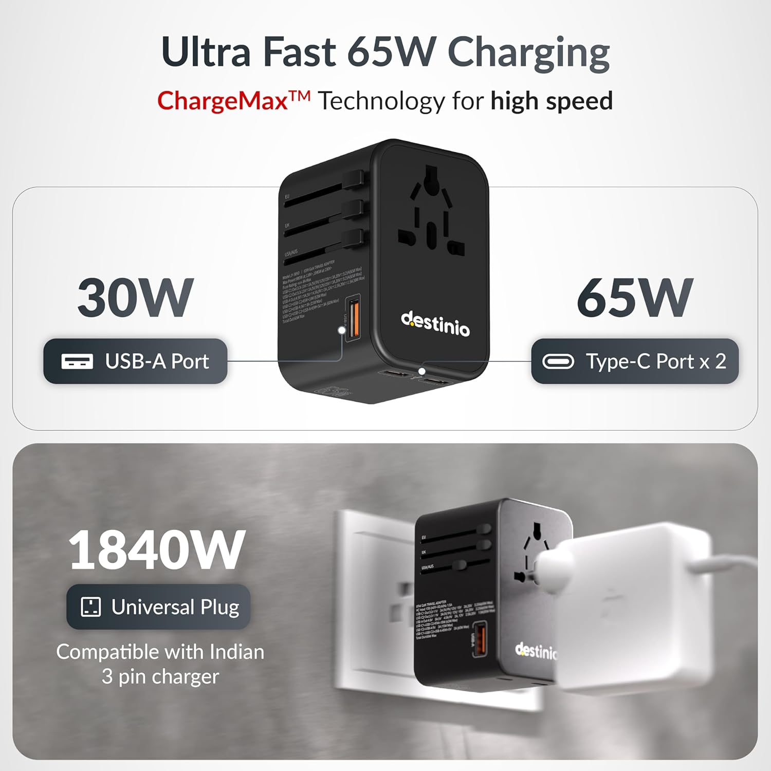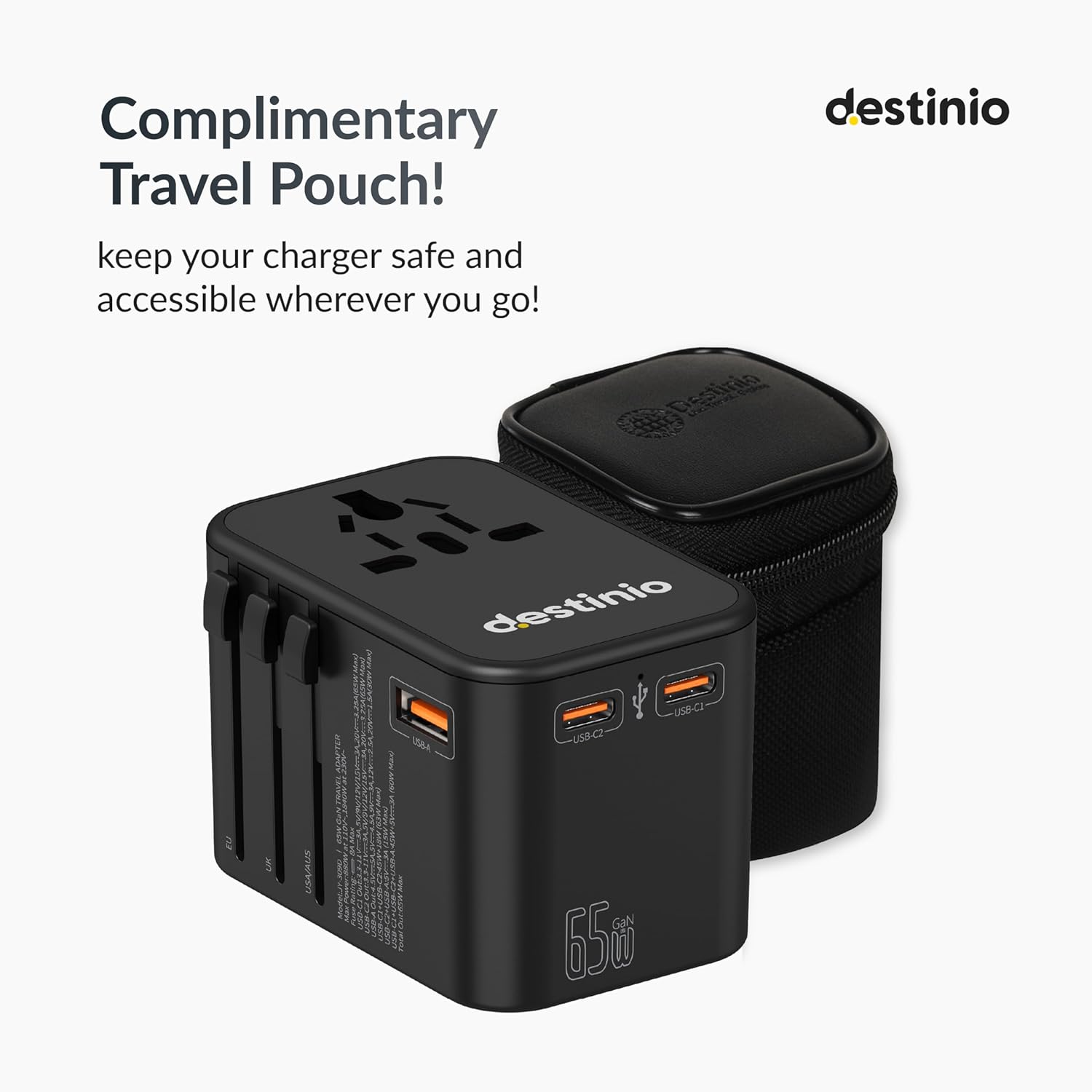 Destinio Universal Travel Adapter – 65W Laptop/MacBook GaN Fast Charging Adapter with 2 Type C & 1 USB Ports, Universal Charger Adapter, All in One International Travel Adapter for US, UK, Europe