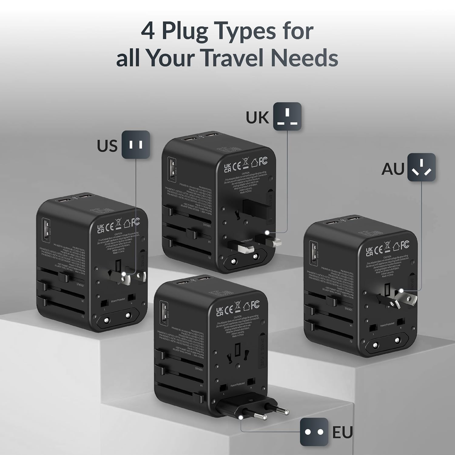 ✅SMART FAST CHARGING WITH 3 USB PORTS: This universal travel adapter features 2 Type C ports (PD & QC 3.0 compatible) and 1 USB A port, enabling high-speed charging for up to 4 devices simultaneously. The built-in smart IC chip adjusts the current output automatically, ensuring efficient charging for your devices. Perfect for powering your gadgets with a universal charger adapter or multi plug adapter during travel.