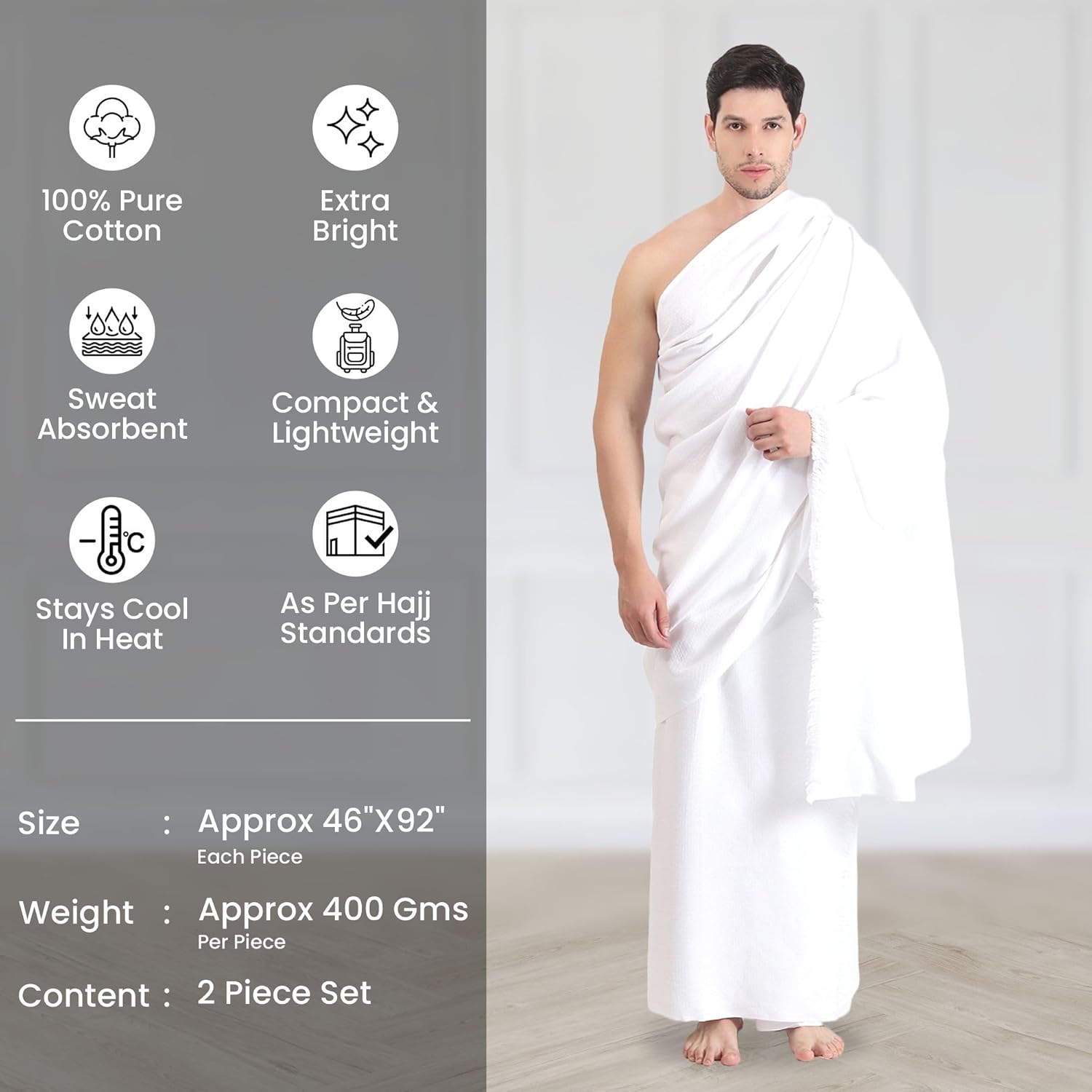 Size – 46×92 inches – Perfect fit for men during Hajj & Umrah.