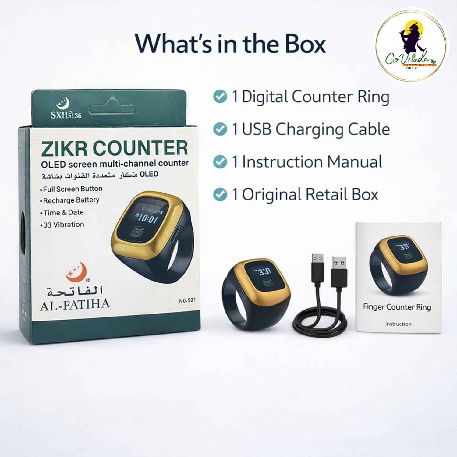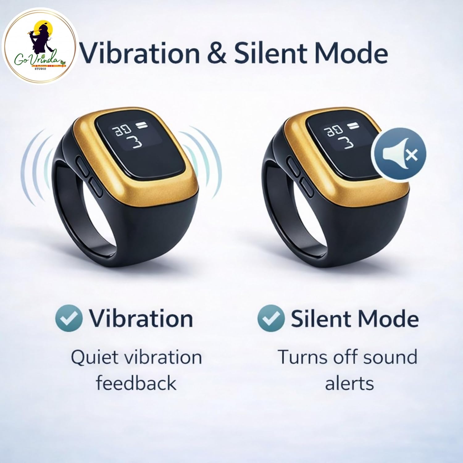 Upgrade your traditional prayer beads with the Go Vrinda Studio Digital Finger Counter Ring (Code 501), a modern, rechargeable smart tally counter designed for spiritual focus and daily discipline. Whether you practice mantra jap, naam japa, tasbih, dhikr, zikr, meditation or mindfulness chanting, this compact digital counter ring helps you track every count accurately without distraction. Featuring a bright OLED HD display, this smart counter clearly shows your current count, battery level, time and date. With the ability to count up to 99999, it is perfect for extended chanting sessions, daily spiritual routines, or structured repetition practices. Unlike traditional rosary or japamala beads that can be bulky or easy to lose count with, this digital finger counter ring offers one-touch operation. The large full-screen button allows effortless counting with a simple press. Long press functionality enables screen rotation, ensuring convenient viewing from any angle. Designed with 4 intelligent vibration modes, the device can alert you at 33, 66, 99 or 100 counts — ideal for tasbeeh cycles, mala rounds, or customized repetition goals. You can also switch to silent mode for peaceful meditation without sound interruptions. The built-in multi-channel memory system allows you to switch between counting sessions easily, making it suitable for tracking multiple chants or routines throughout the day. This device is powered by a long-lasting rechargeable battery, eliminating the need for constant cell replacement. Simply recharge using the included USB cable for continued performance. Its ergonomic ring design is lightweight, compact and comfortable for extended wear. It fits securely on your finger, allowing one-hand operation — perfect for prayer, travel, gym workouts, walking, knitting or daily habit tracking. Suitable for Hindu, Muslim, Buddhist, and all spiritual practitioners, this smart tasbih counter ring is also widely used for gym repetition counting, step tracking, knitting stitch counting and goal tracking. If you are looking for a modern, durable, accurate and portable digital prayer counter, the Go Vrinda Studio Digital Finger Counter Ring offers the perfect balance of technology and devotion.