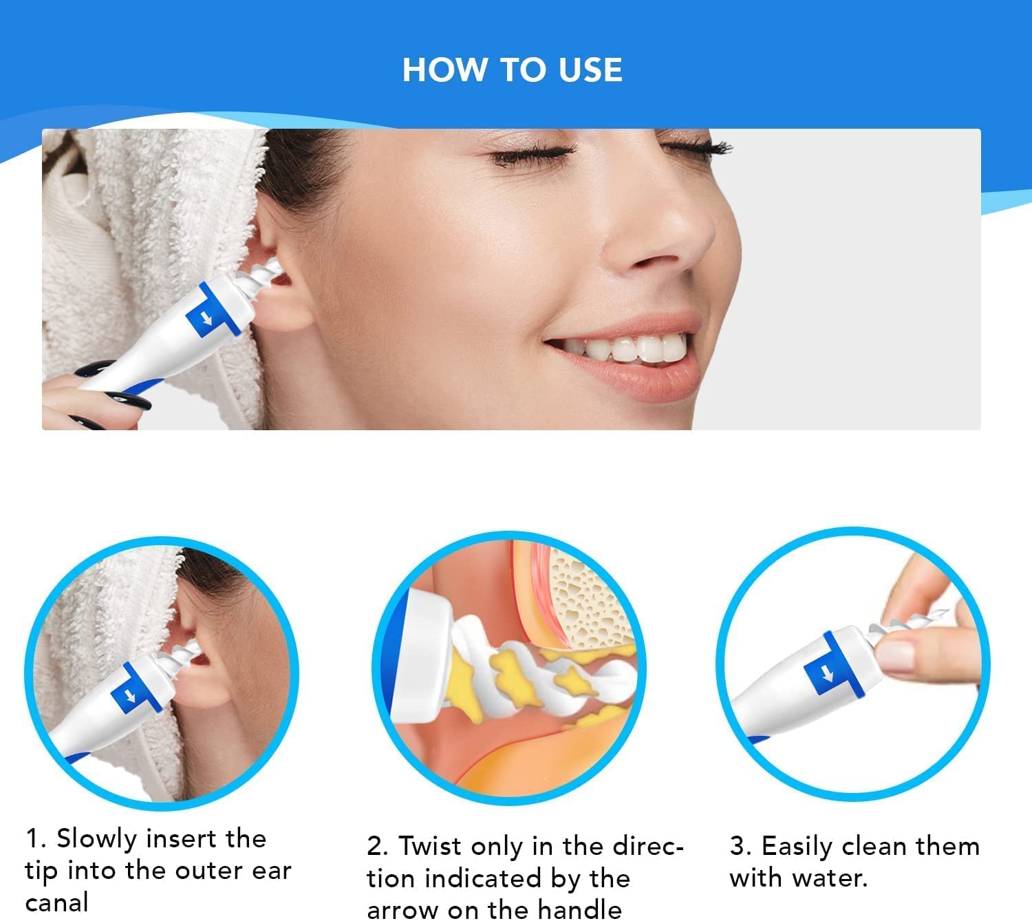 ADVANTAGES OF OUR PRODUCTS The spiral tips of this ear cleaner is made of soft and flexible silicone, so this ear cleaner tool can remove ear wax without hurting your itching ear canal like metal q grips earwax removers. Just insert the tip carefully and slowly into your ear canal, then twist in direction of the arrow on handle. The tips can be easily cleaned with water, and it comes with 16 washable replacement tips to maintain healthy ear canals. These Ear Spiral Cleaner are made of ABS + TPE, are safe,soft, flexible and maintain the health of your family.Using ergonomic handle, bright and clean, feel lubrication, spiral design, paste the ears, easier to clean.Ear Wax Removal Traditional ear cleaners, ear spatulas, and cotton ear swabs can be dangerous to use to remove wax. Push too far, and other wax can cause pain, or push the wax deeper into the ear. Therefore, we recommend this ear cleaner swab, which is safer than other swabs. Product: Spiral silicone earwax cleaning tool Tips Quantity: 16 Tips /Set Material: ABS+ Silicone Size: 4 x 0.6 x 0.6(in)