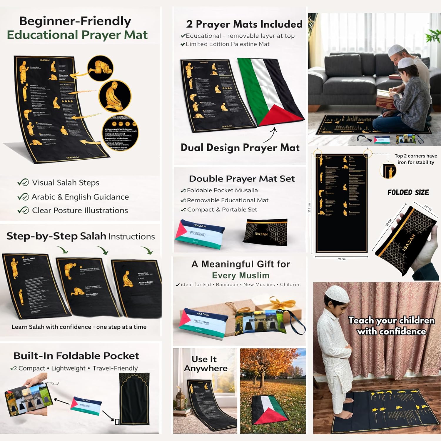 Whether you are a new muslim revert or you want your children to learn how to pray Salah efficiently, this is the perfect prayer mat you have been looking for.