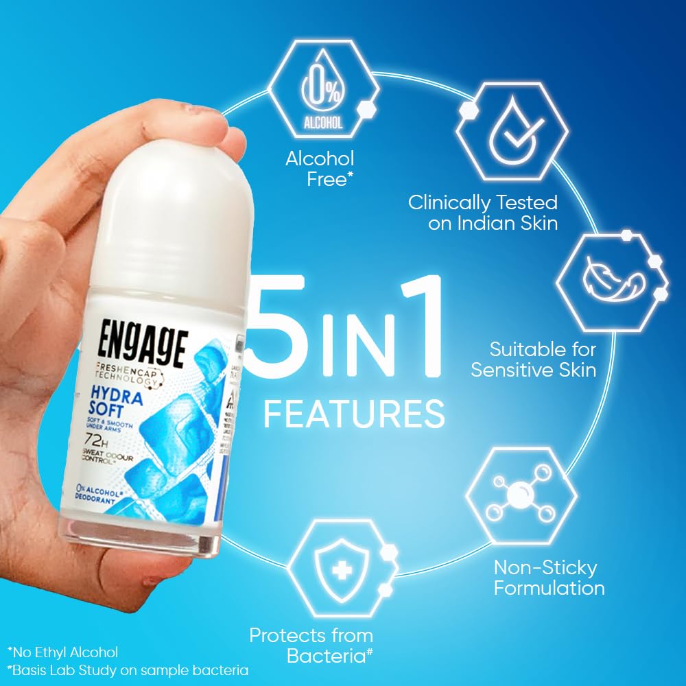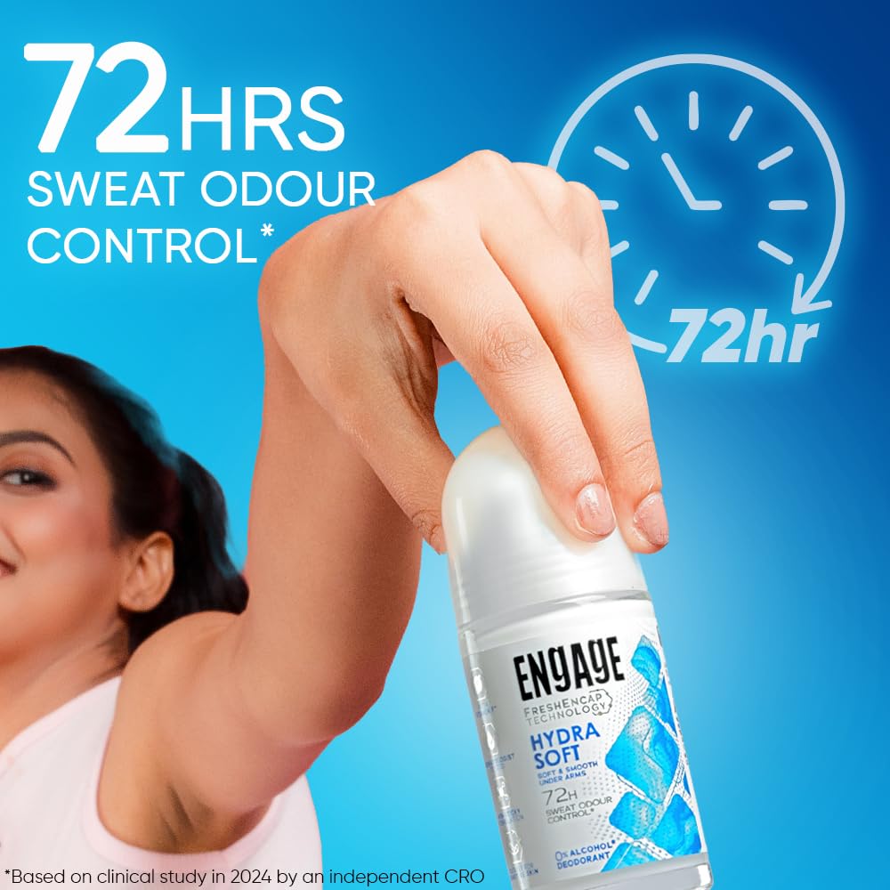 Engage Hydra Soft Underarm Roll On Deo for Women|72 Hour Sweat & Odour Protection|Skin Softening Formula | Advanced Antiperspirant Formula|FreshEncap Technology |0% Alcohol|50ml