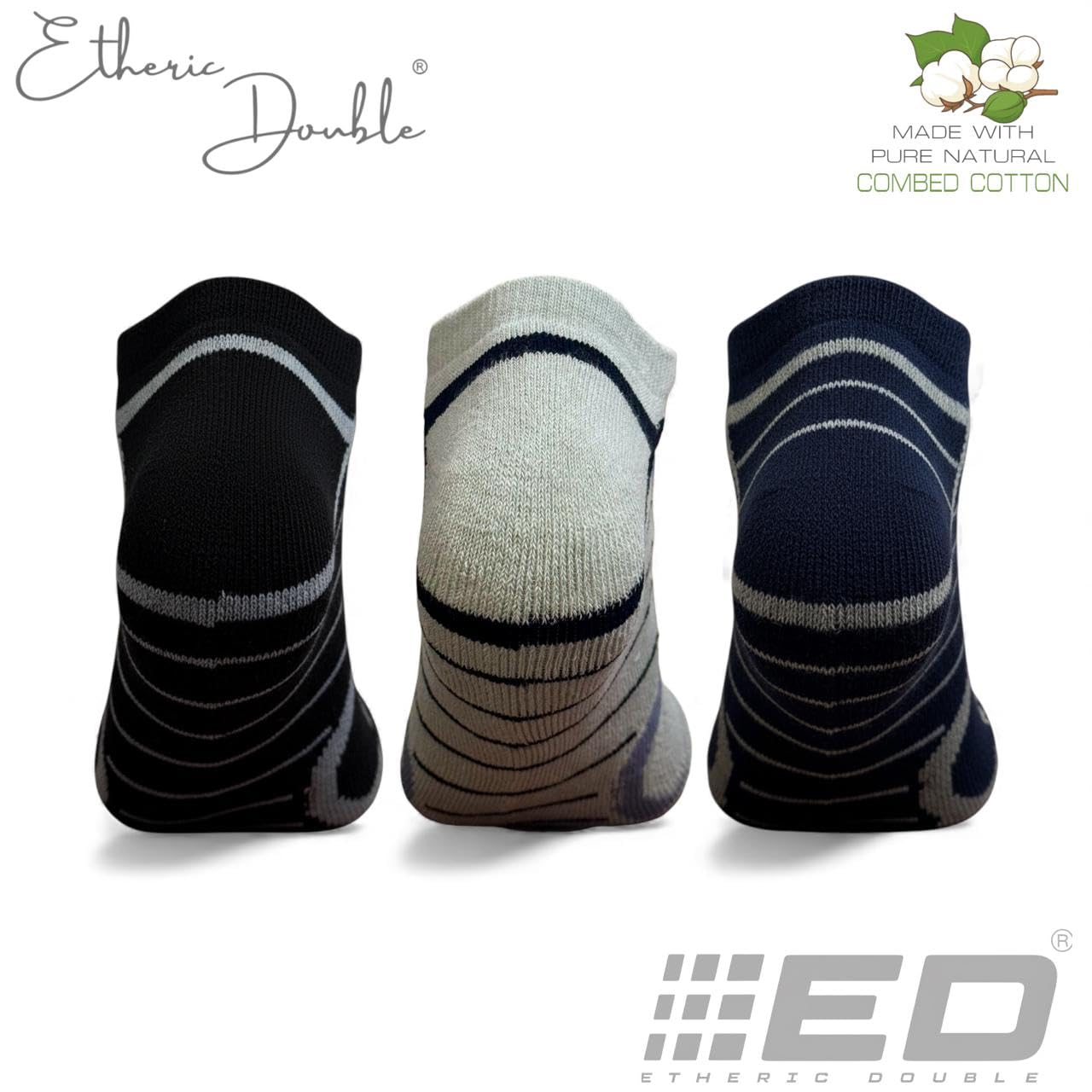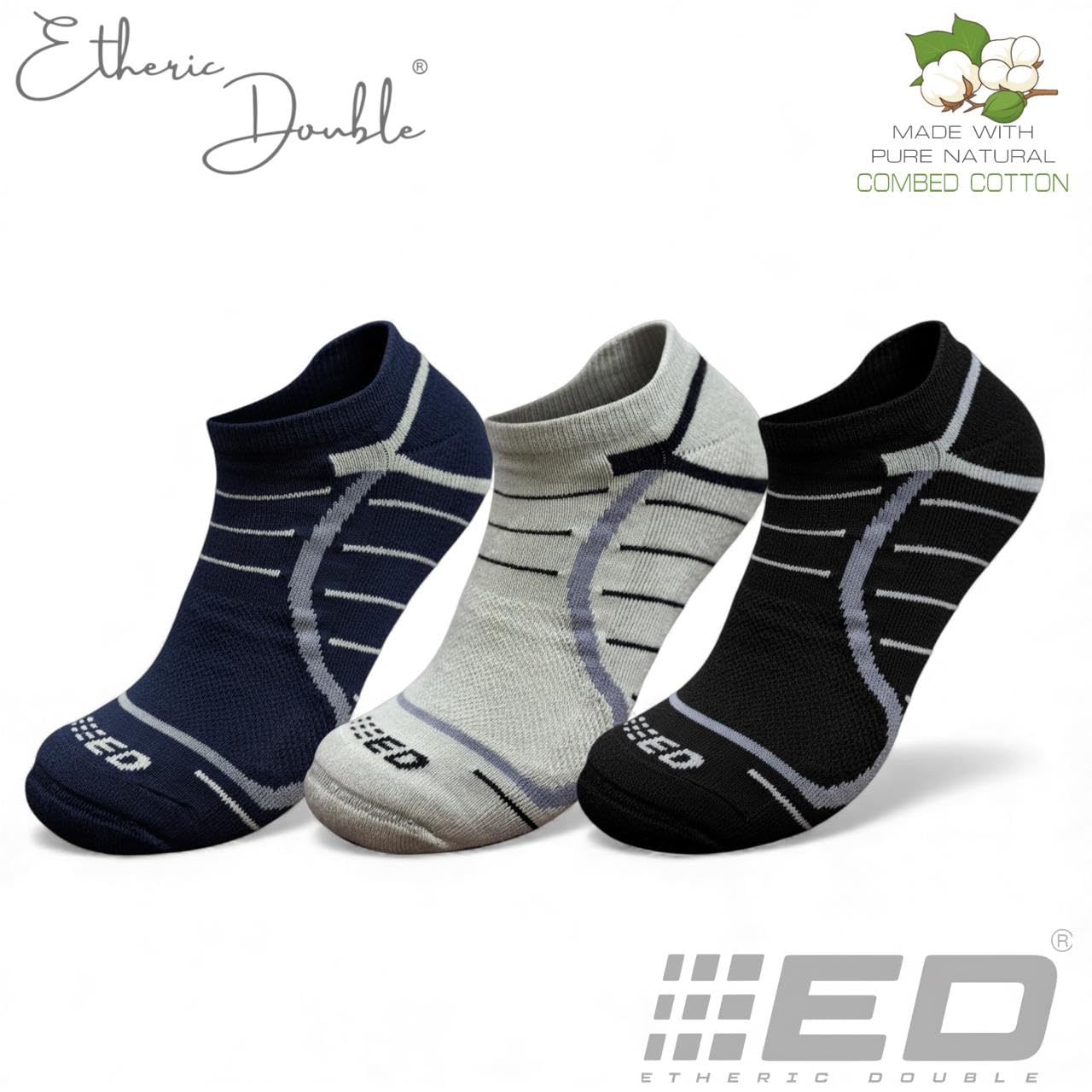 Etheric Double Half Terry Low Cut Socks for Men & Women | Pure Combed Cotton, Seamless Flat Toe, Anti-Odour, Cushioned Footbed, Breathable | Black, Navy, Light Grey | Pack of 3