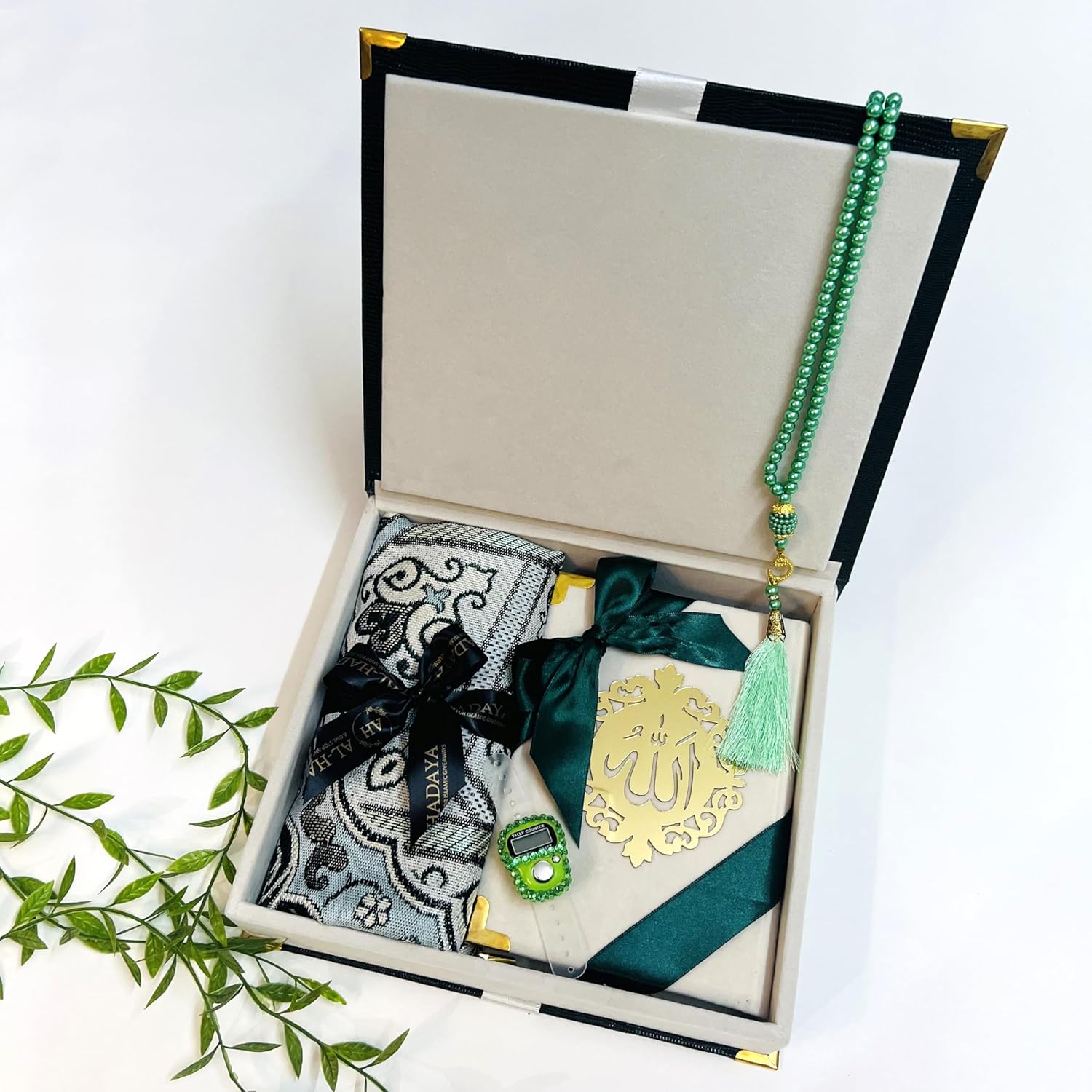 Exquisite Quran Gift Set with Prayer Mat | Unique Islamic Gift for All | Madina Design on Box- Textured Bottle Green | Medium Size Quran with Safari Thin Janamaz