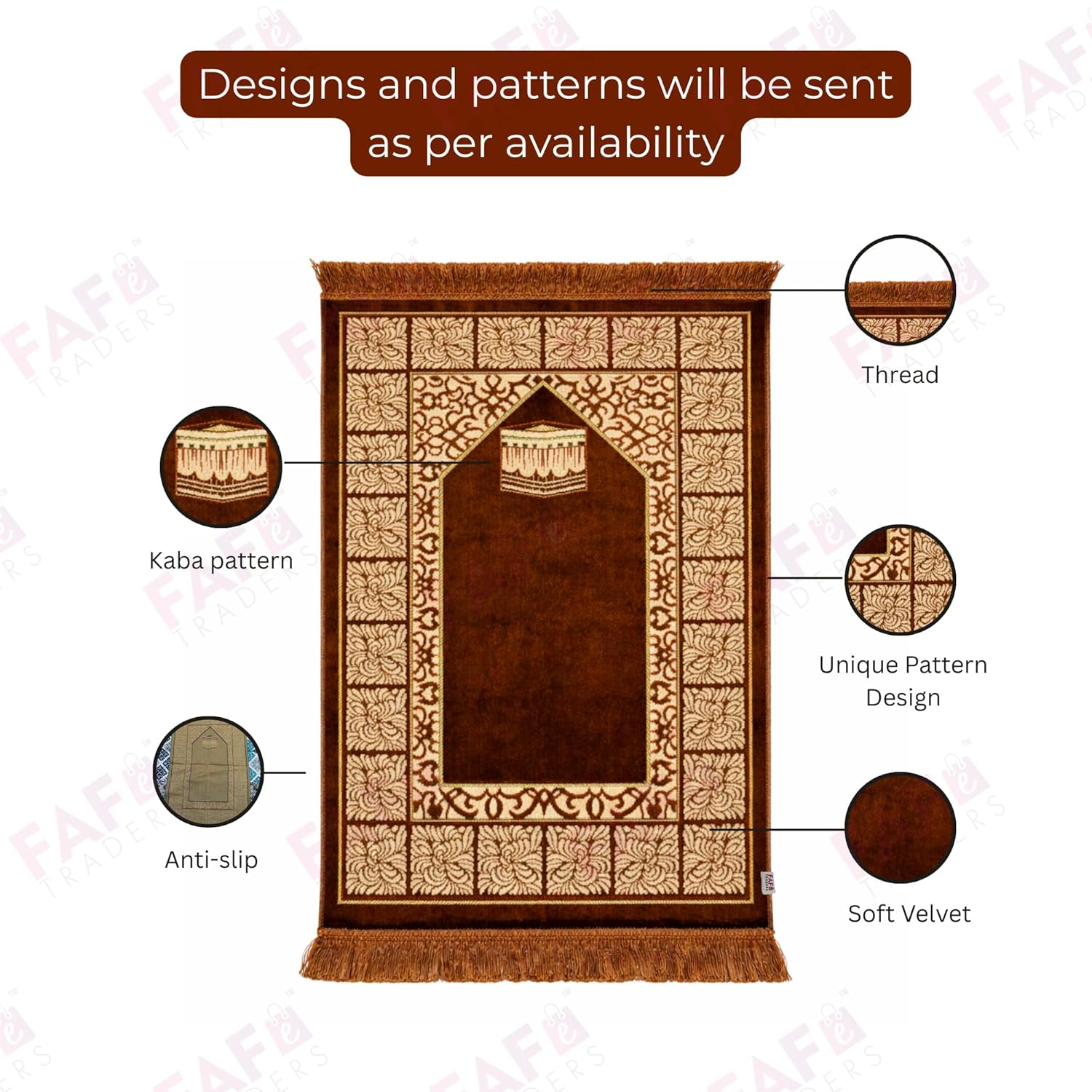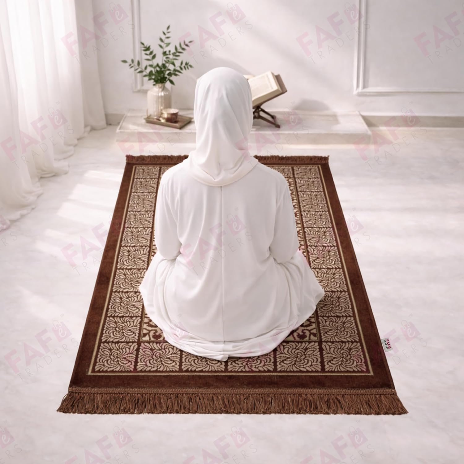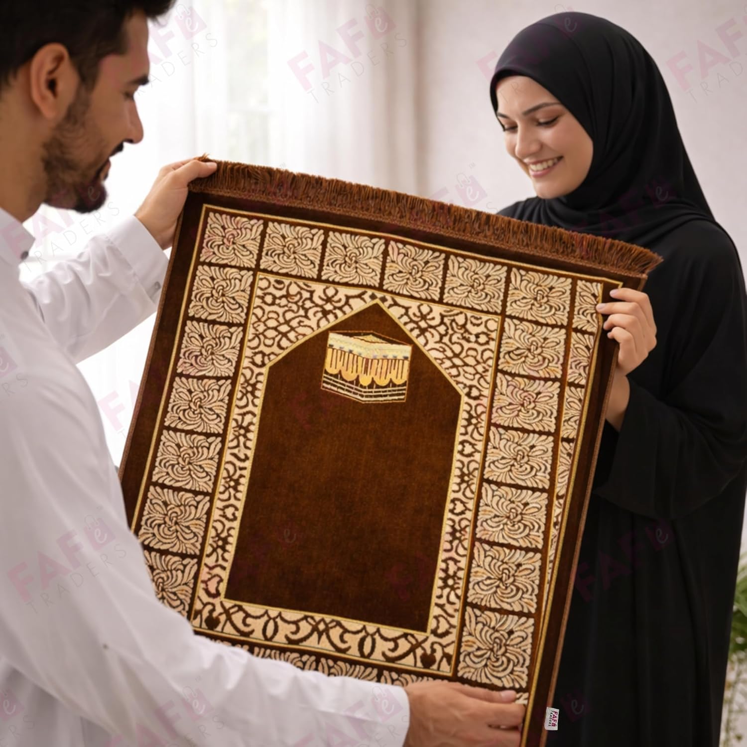 FAF Premium Indo-Turkish Soft Velvet Janamaz Prayer Mat for Men & Women | Lightweight Foldable Muslim Prayer Rug | Anti-Slip Janemaaz for Namaz, Hajj & Umrah | Portable Islamic Mussalla (Brown)