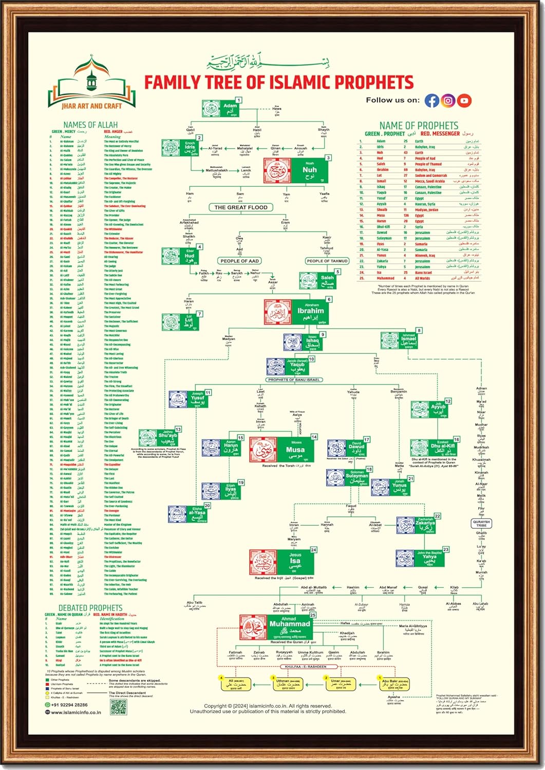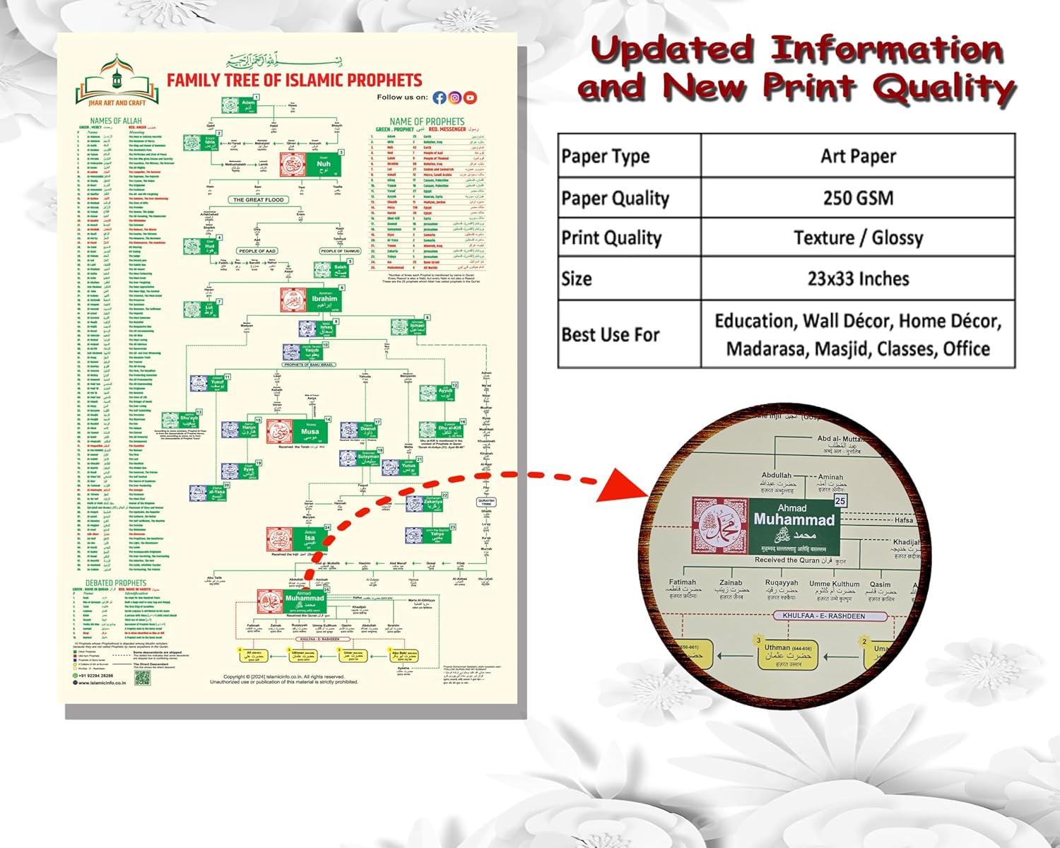 Family Chart of Islamic Prophets & 99 Names of Allah, 23×33 – Glossy Textured Print, 250 gsm Paper WITHOUT FRAME!